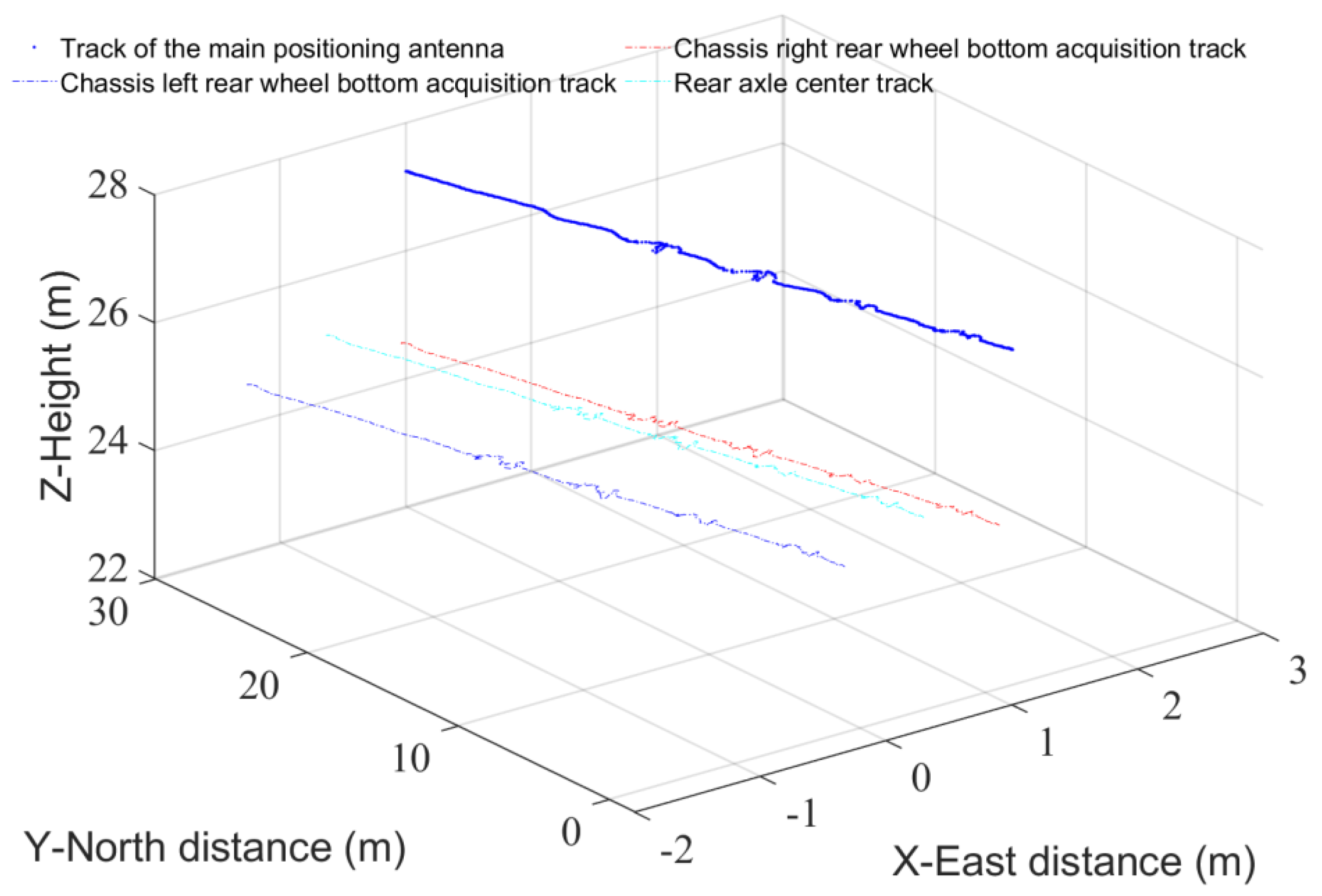 Among these, denotes the distance between the two positioning antennas, represents the distance between the left and right wheel hubs, is the vertical distance from the antenna positioning center point to the right rear wheel hub D, and is the distance projected along the X-axis of the vehicle coordinate system from the antenna positioning center point to the right rear wheel hub D. , , and represent the incremental coordinates of the bottom of the wheel relative to the wheel hub in the x, y, and z directions of the vehicle coordinate system, respectively. denotes the rotation angle of the vehicle coordinate system relative to the local tangent plane coordinate system’s X-axis, and is the wheel diameter.