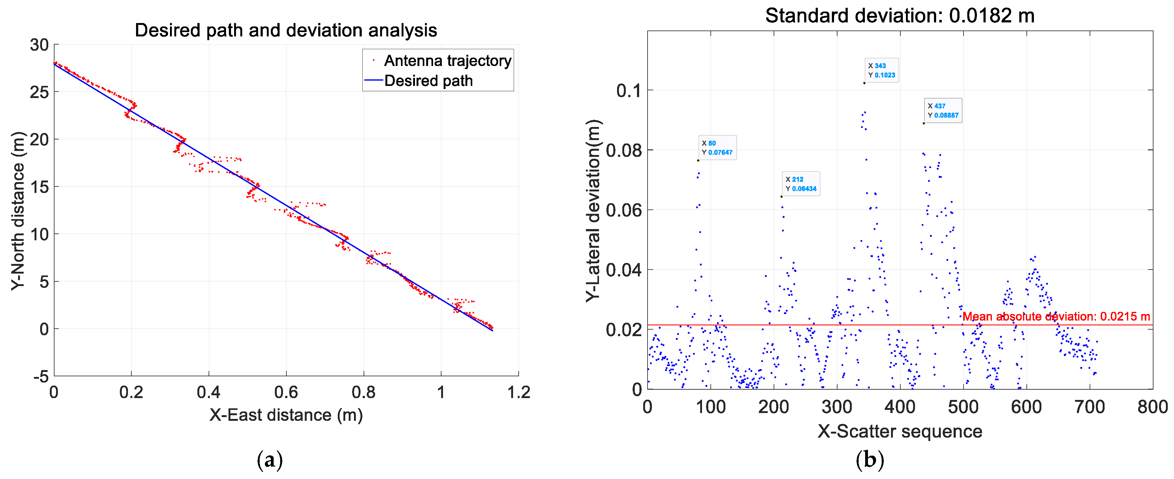Antenna trajectory and its lateral deviation: (a) antenna trajectory; (b) antenna lateral deviation.