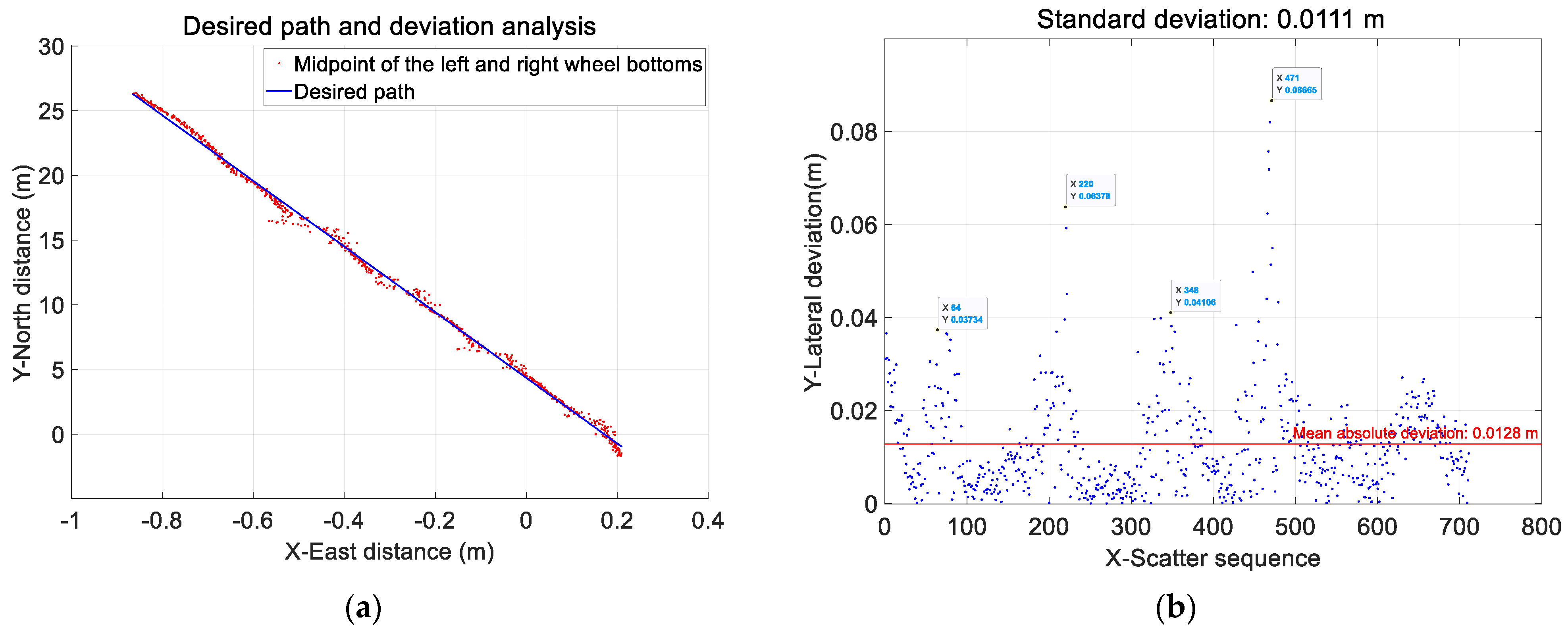 Center trajectory of the rear axle on agricultural machinery and its lateral deviation: (a) center trajectory of agricultural machinery rear axle; (b) lateral deviation of agricultural machinery rear axle center.
