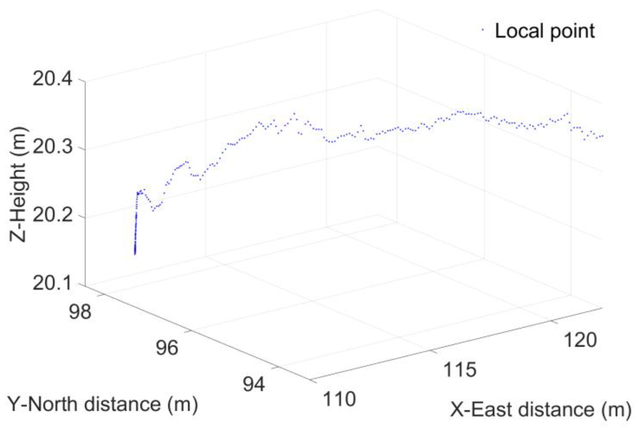 Agricultural machinery operates on hard bottom layers, with wheels exerting force upon the hard bottom layer contour. Due to the absence of shock-absorbing suspension on the rear axle, the contour surface of the hard bottom layer directly impacts the vehicle’s wheels. This force induces displacement and attitude changes in the wheels contacting the hard bottom layer. By utilizing GNSS position and AHRS attitude data from the machinery, discrete point clouds