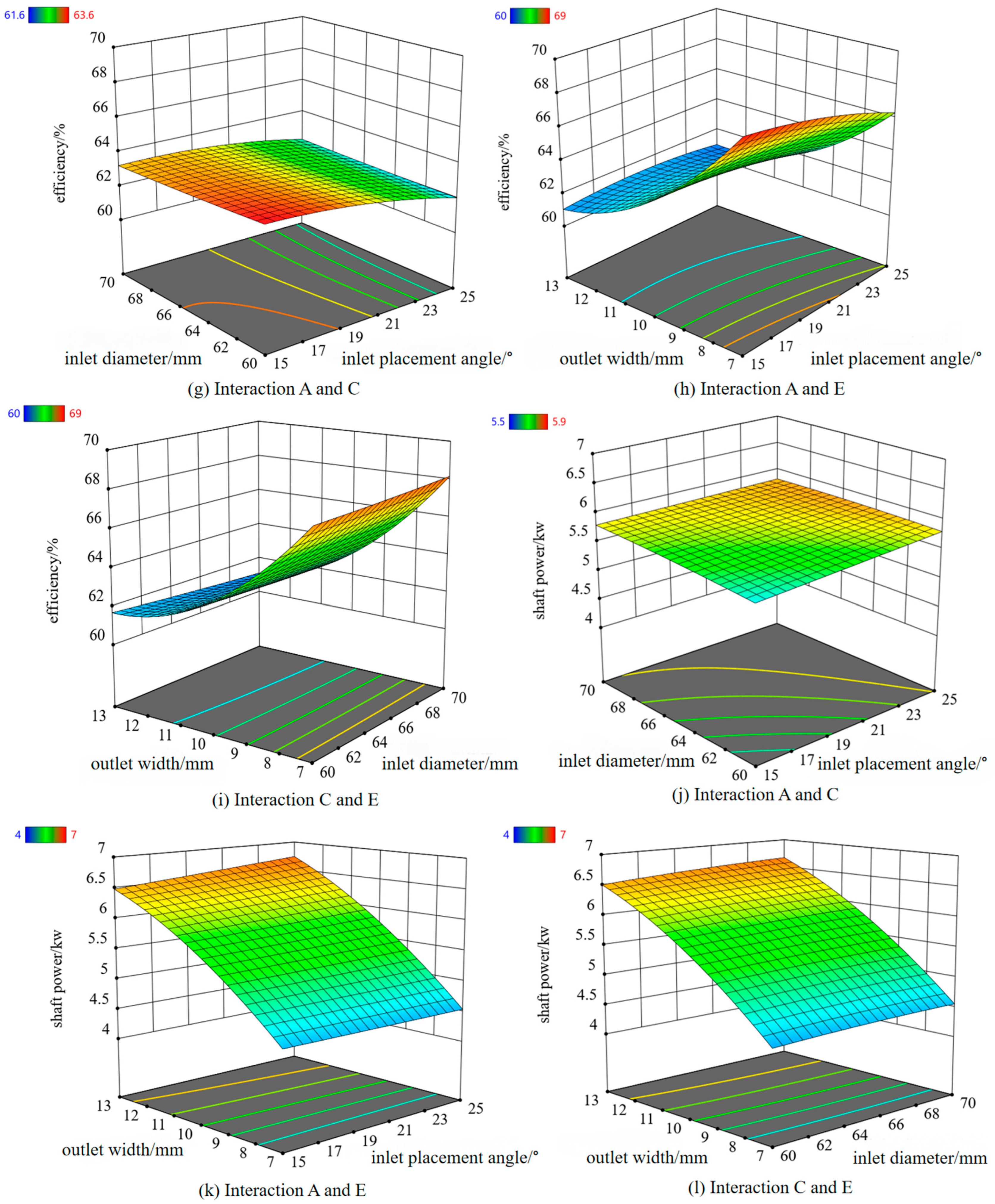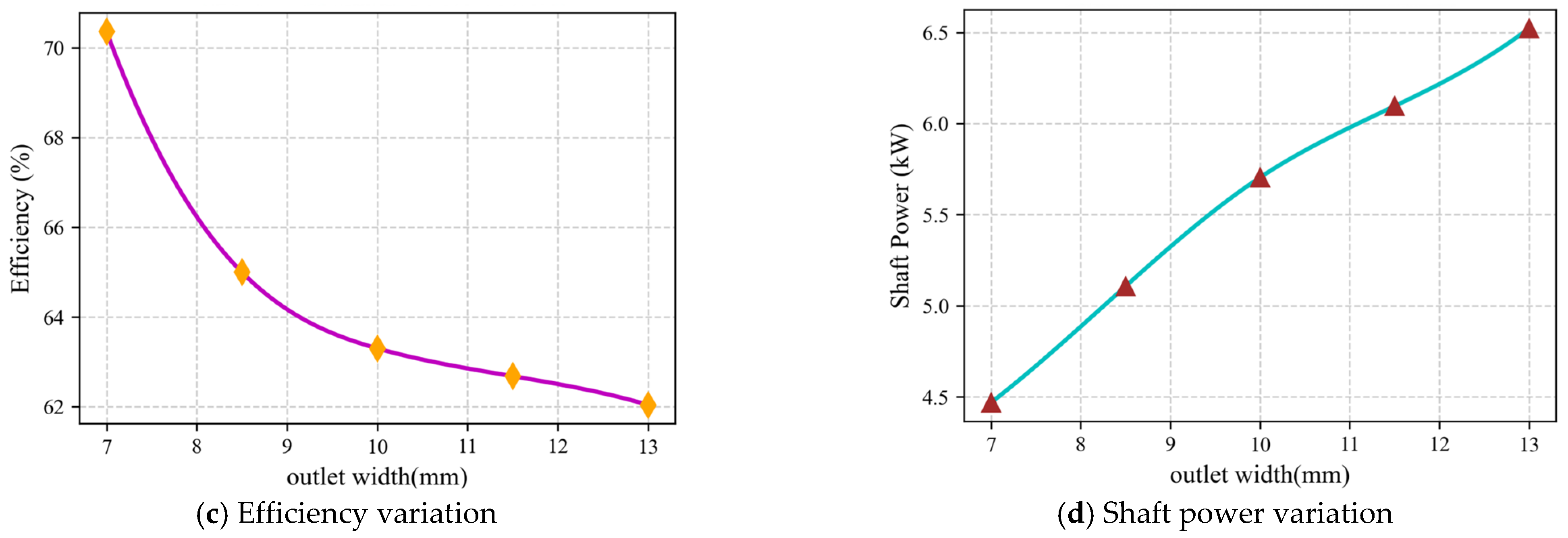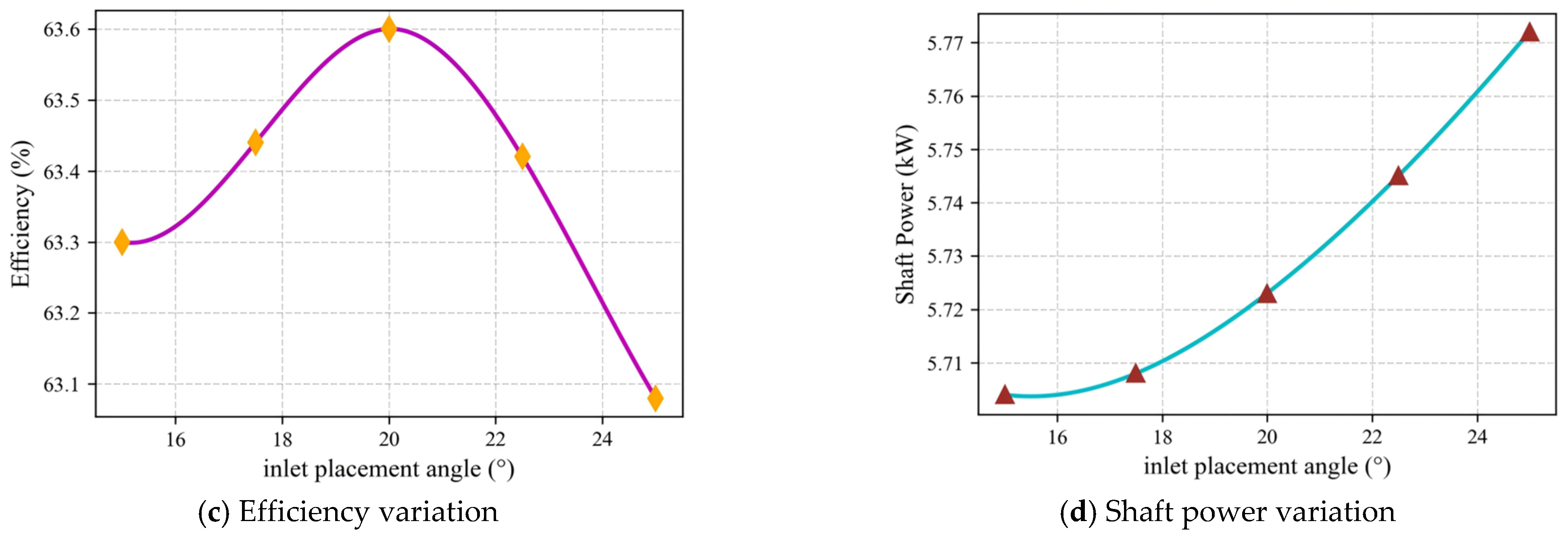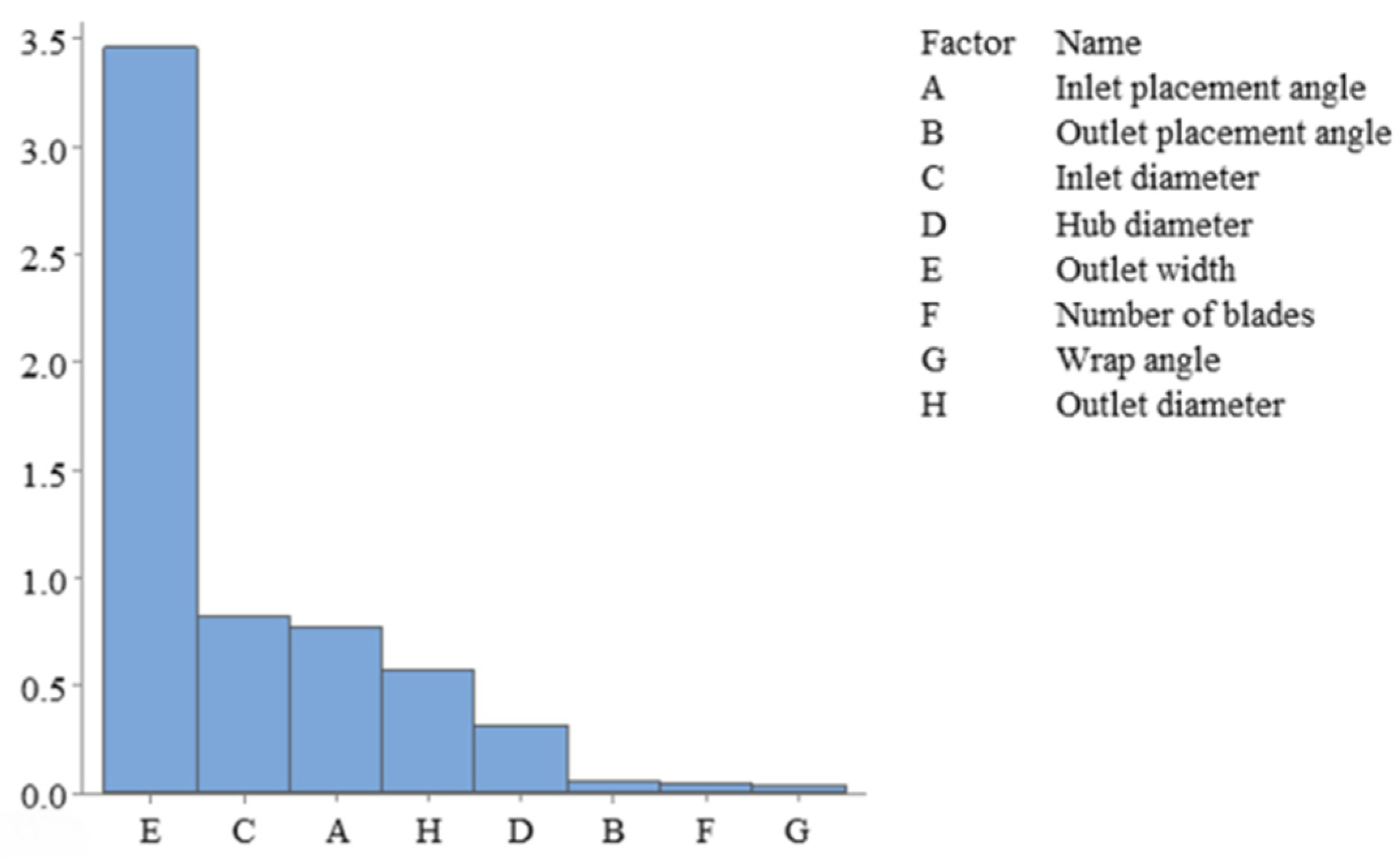 | No. | Inlet Placement Angle (°) | Outlet Placement Angle (°) | Inlet Diameter (mm) | Hub Diameter (mm) | Outlet Width (mm) | Number of Blades | Wrap Angle (°) | Outlet Diameter (mm) | H (m) | (%) |