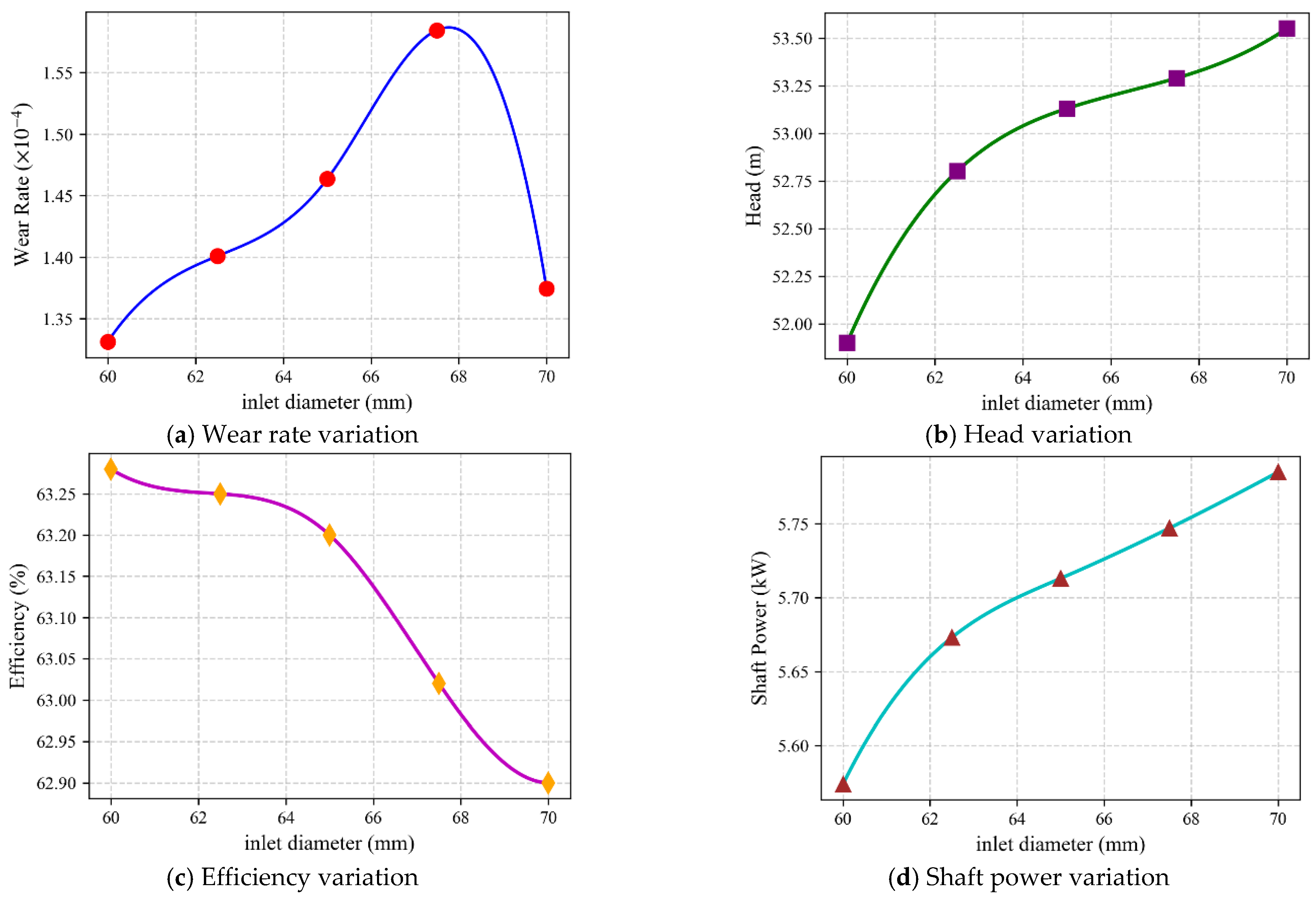 | Model | Outlet Width (mm) | Inlet Diameter (mm) | Inlet Placement Angle (°) | H (m) | P (kW) | η (%) | Average Wear Rate (kg·m−2·s−1) |