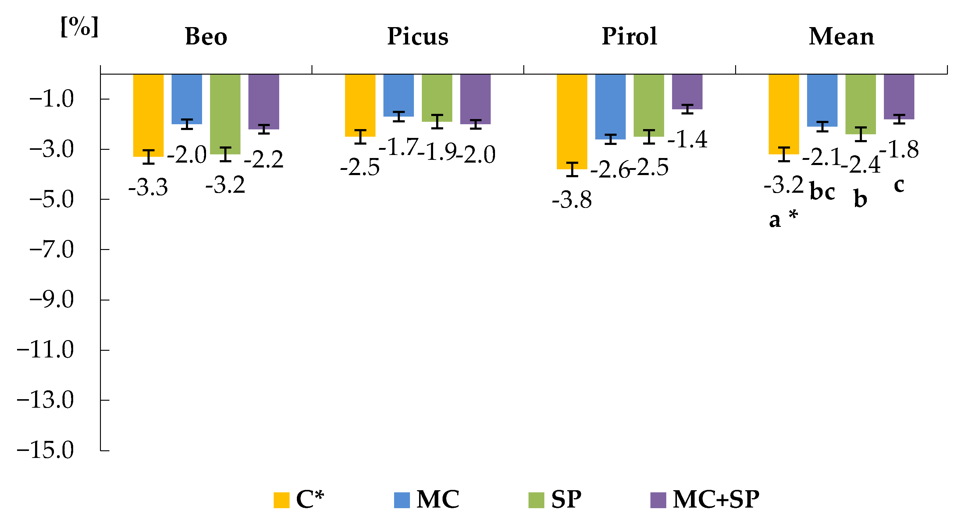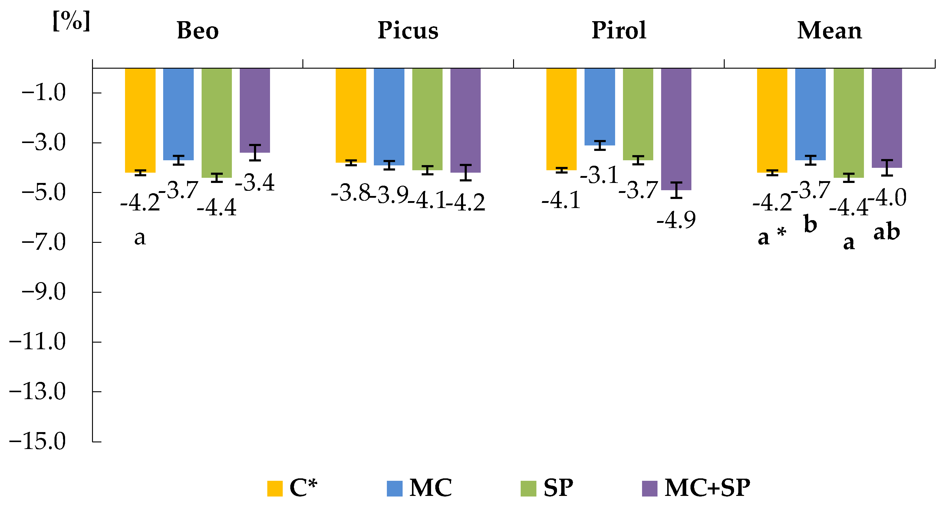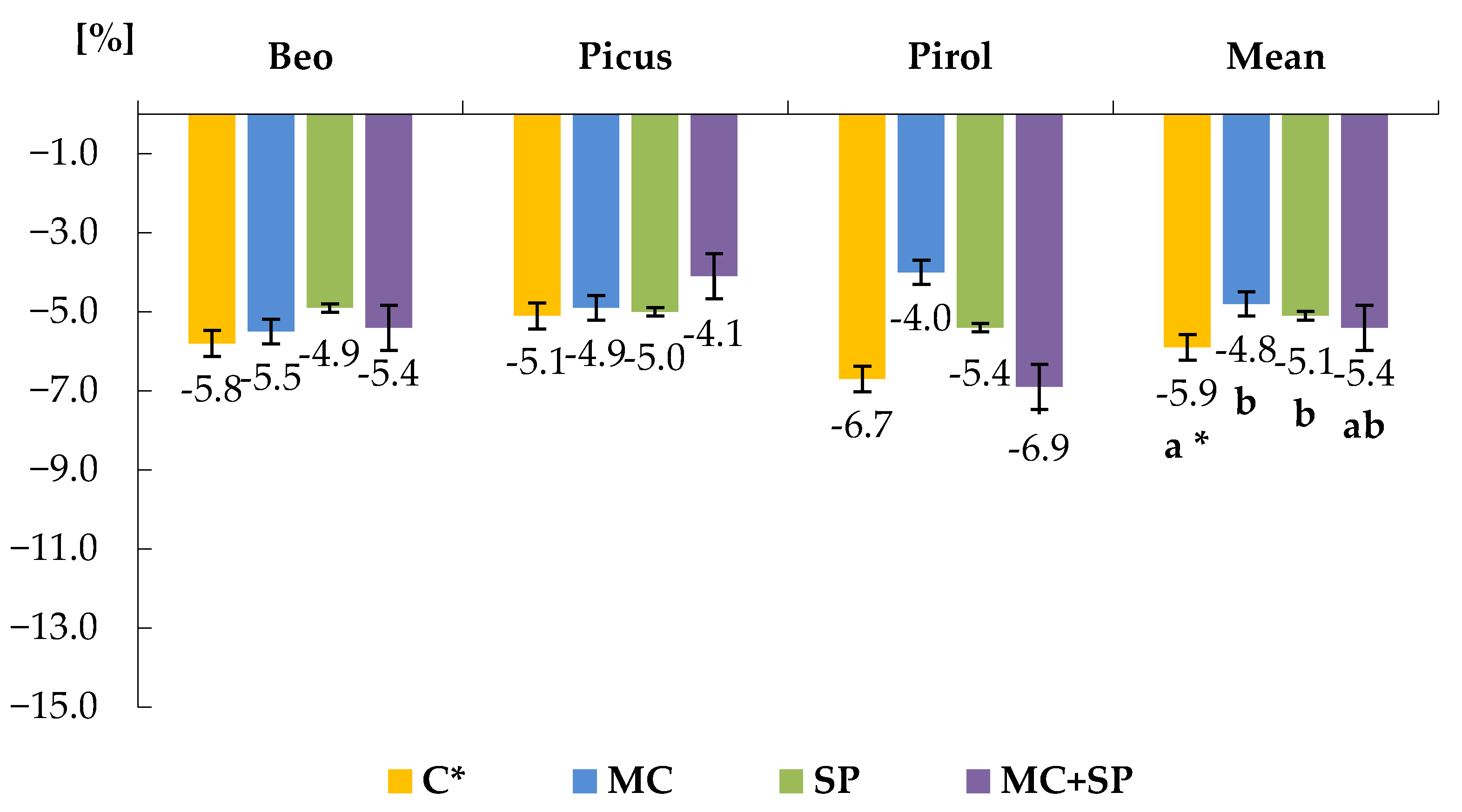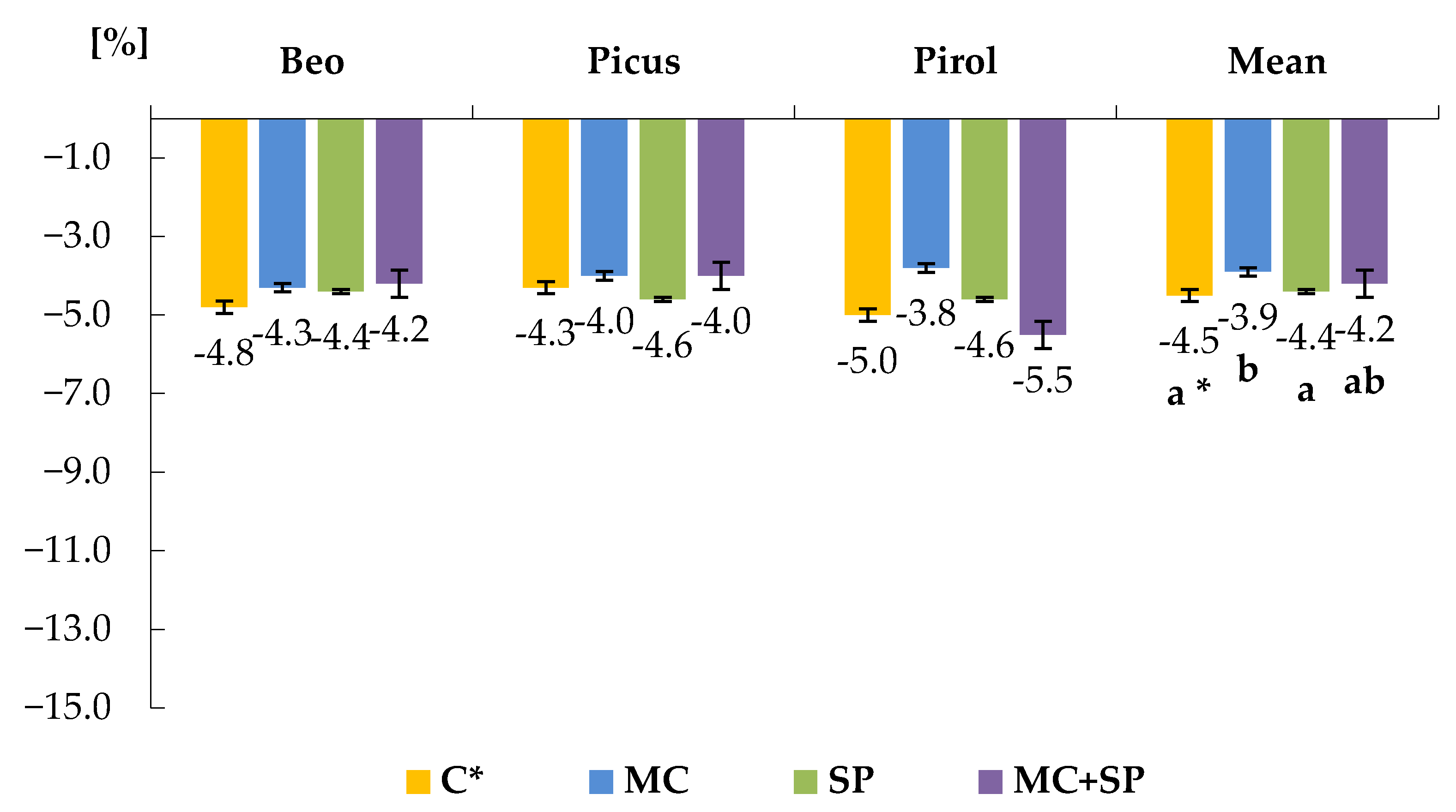 | MC + SP | 4.8 ± 0.4 | 4.6 ± 0.2 | 4.7 ± 0.3 | |