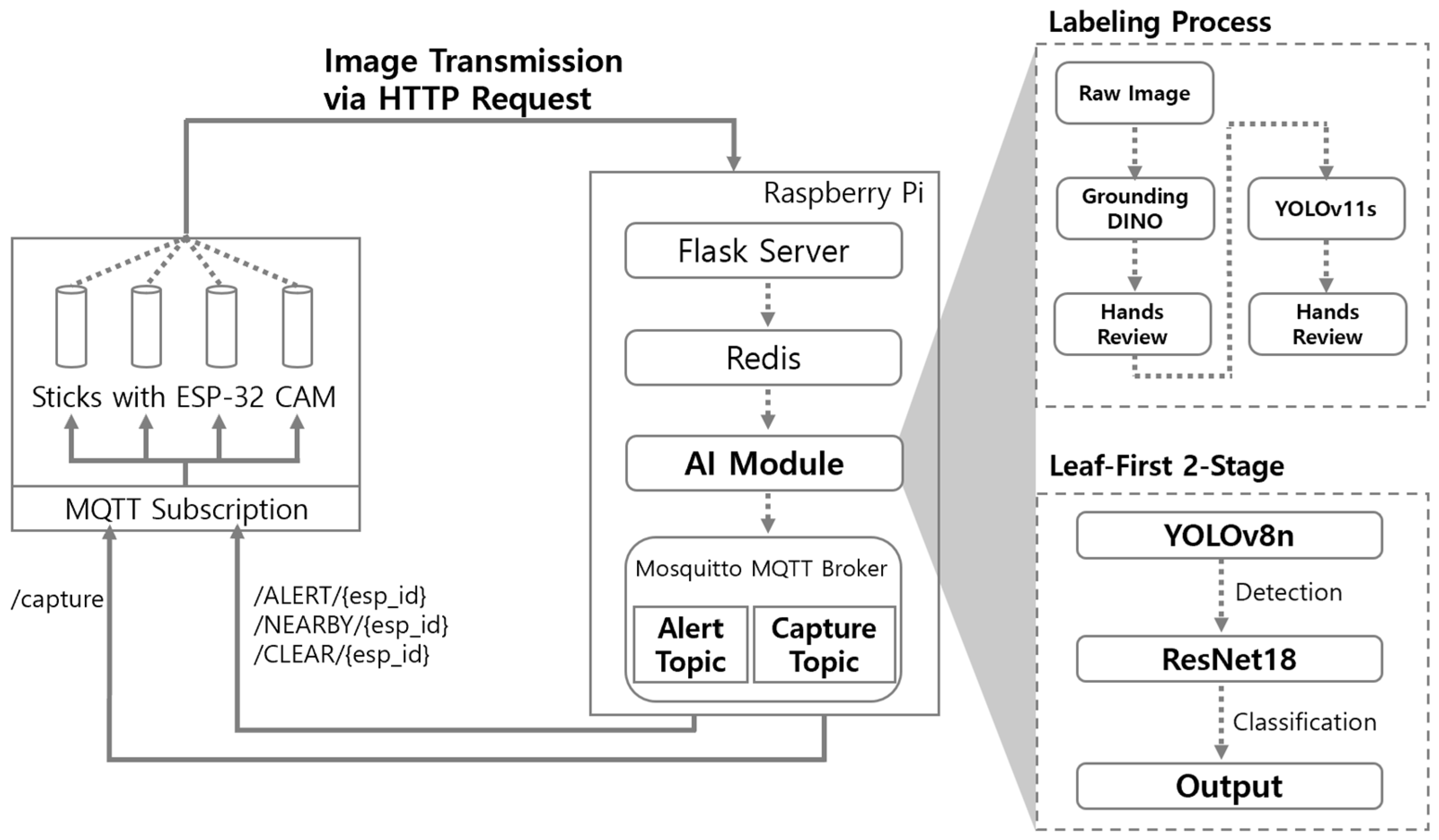 Second, unlike expensive cloud-based systems, we constructed a cost-effective IoT architecture using AI-Thinker ESP32-CAM module (ESP32-CAM) and Raspberry Pi. This edge-based standalone system was designed to perform AI-based diagnoses by simply powering the device. Consequently, it allows aging farmers who may not be familiar with smart devices to use the system intuitively without requiring specialized training.