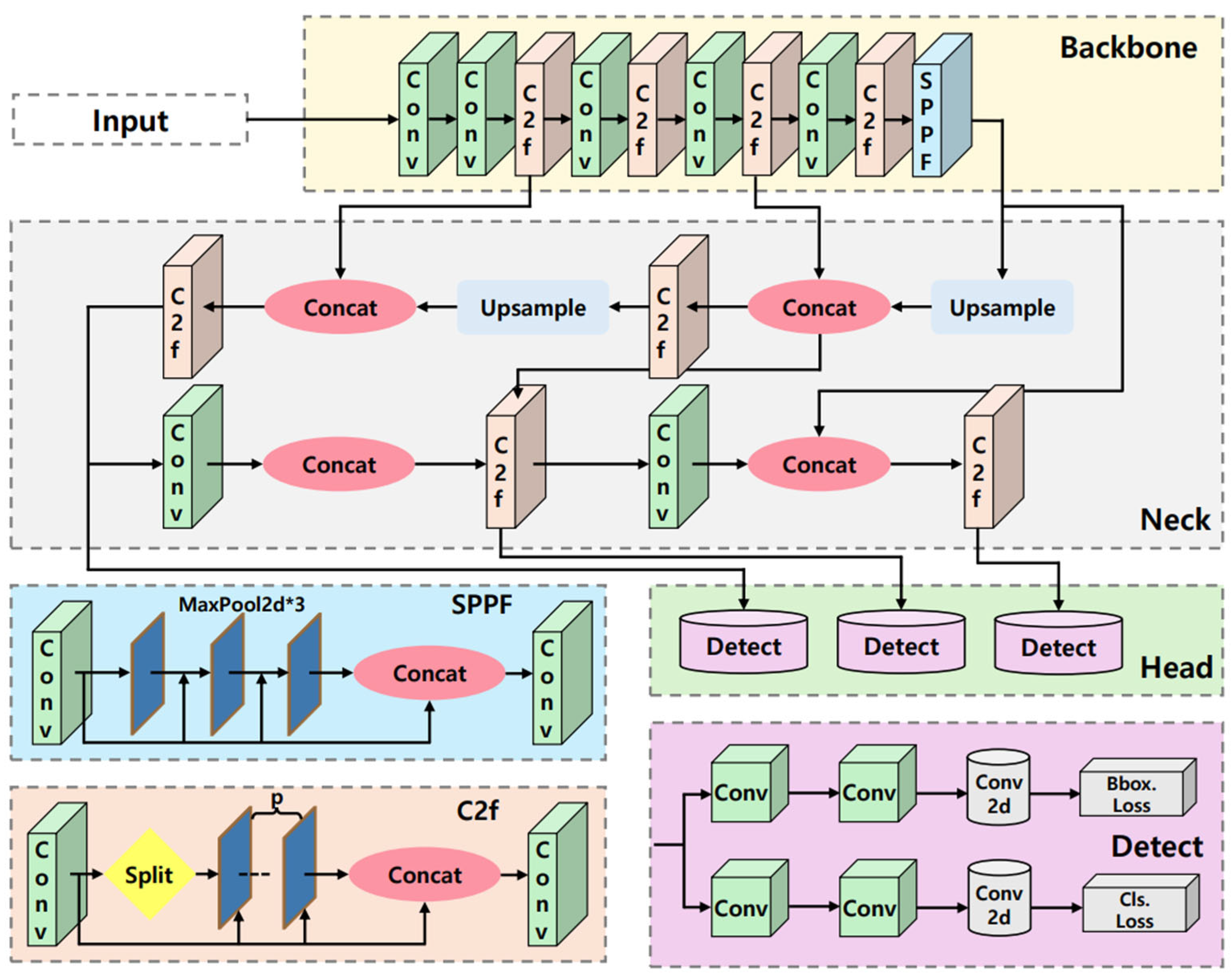 Figure 2 illustrates the overall architecture of YOLO. YOLO is a single-stage object detector that predicts the object locations in a single forward pass. The backbone extracts key visual patterns from the input image, the neck aggregates multiscale feature maps, and the detection head directly outputs bounding boxes and class scores at each grid or anchor point. The final output consists of bounding boxes and their corresponding confidence and class scores, followed by non-maximum suppression (NMS) to remove redundant detections.