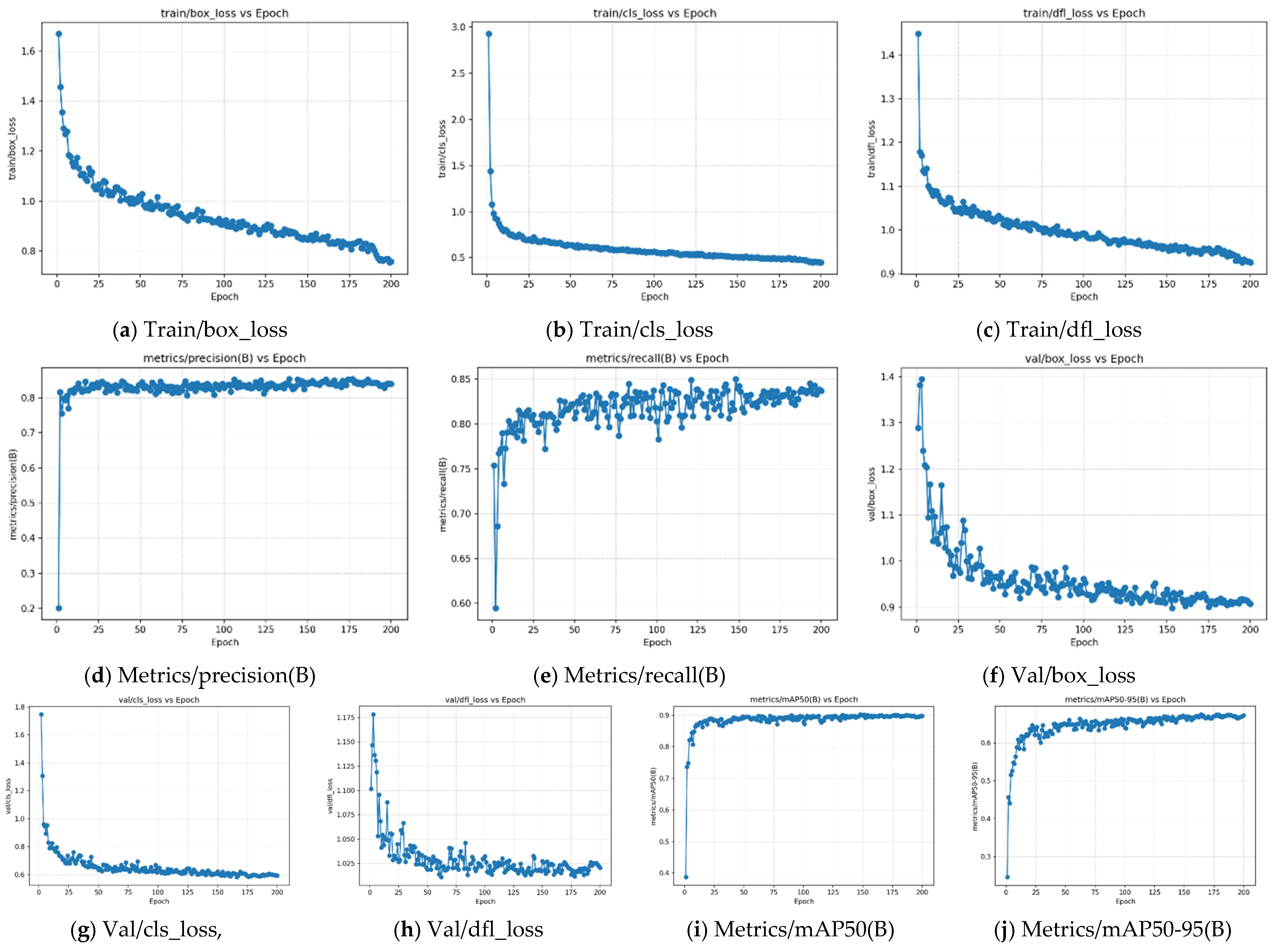Y Training, validation, and detection performance metrics of the YOLOv8n model across epochs. (The first row shows training loss curves, the second row presents precision, recall, and validation box loss, and the third-row reports validation classification losses and detection performance metrics (mAP@0.5 and mAP@0.5:0.95)).