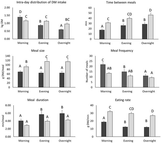 ) total mixed rations (the three 8 h periods were morning 08:00–16:00 h, evening 16:00–24:00 h and overnight 24:00–08:00 h; A, B, C, D: bars with different letters are significantly different at p < 0.05).