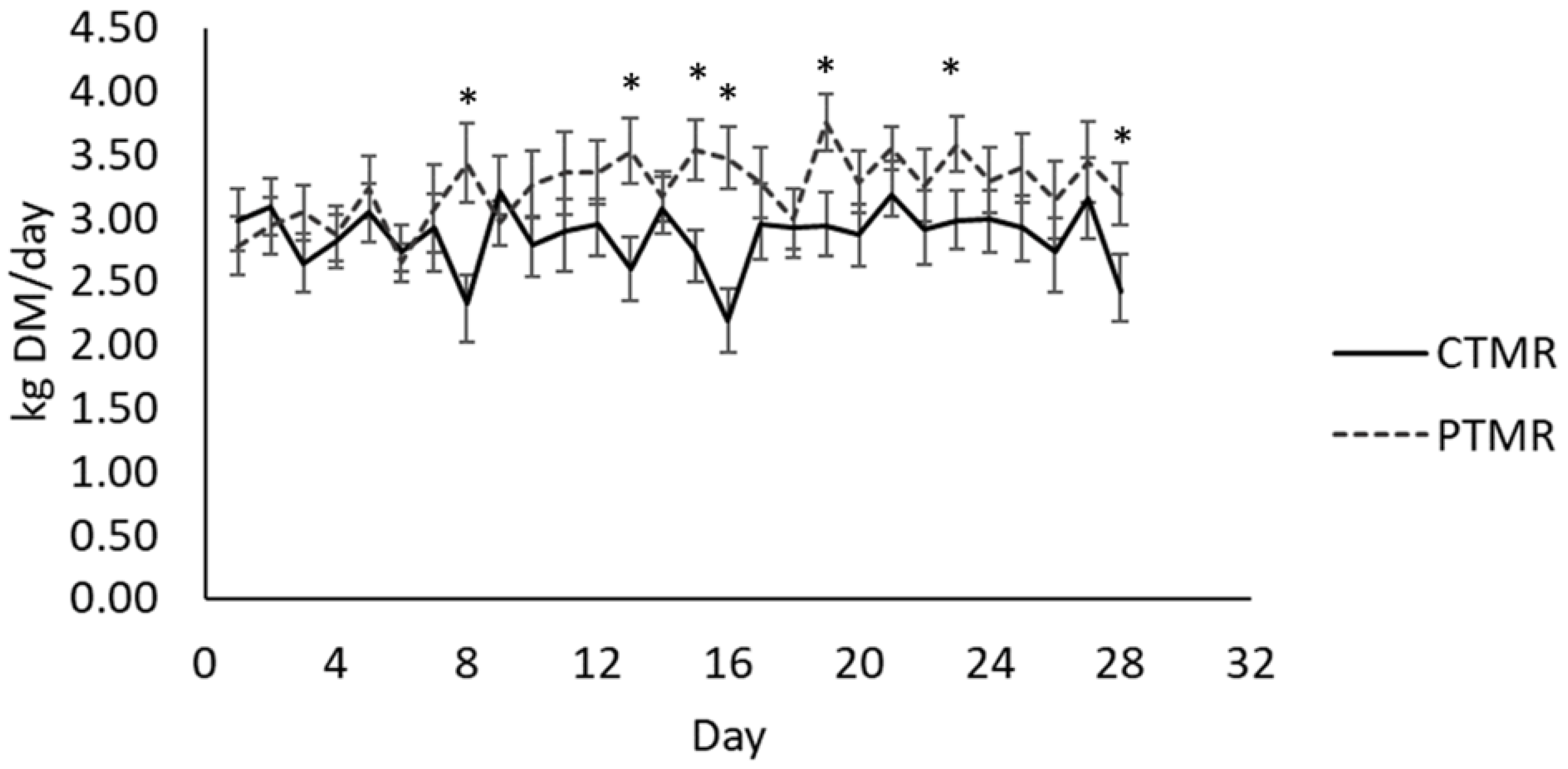 | Ingredients (g/kg of Total Mixed Ration as Fed) | CTMR | PTMR |