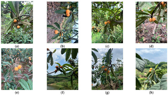 Loquat dataset collected under different conditions: (a) Isolated fruit; (b) Cluster of fruits; (c) Sunny day; (d) Cloudy day; (e) Front lighting; (f) Back lighting; (g) Obstruction; (h) Ultra-long distance. These categories are used to reflect the model’s adaptability under complex conditions such as lighting variations, occlusions, and changes in viewing distance, providing critical foundations for subsequent training and performance evaluation.