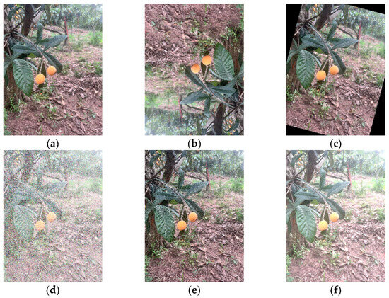 Image enhancement of loquat fruit: (a) Raw images; (b) Flip; (c) Random rotation; (d) Random noise; (e) Sharpen; (f) Different brightness. These augmentation strategies aim to simulate variations in viewpoint, imaging noise, and lighting conditions that may occur in orchard environments. This enhances the model’s robustness and generalization capabilities in complex scenarios, providing a more diverse sample distribution for subsequent training.