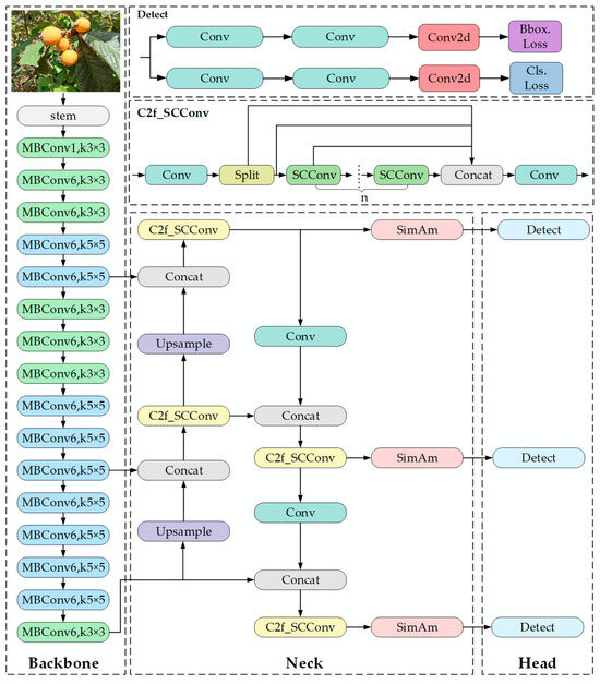 The YOLOv8n algorithm combines high detection precision with a lightweight model. However, its detection performance still has certain limitations in orchard scenarios. These limitations are particularly evident in complex situations, such as dense loquat distribution, mutual fruit occlusion, and overlap with branches. This study entails the implementation of specific optimizations within the YOLOv8n framework to improve the algorithm’s efficacy in detecting loquat targets within orchard environments. Three specific optimizations were implemented for the YOLOv8n framework. Firstly, the initial backbone network was replaced with the lightweight EfficientNet-b0 architecture, which significantly reduces model complexity. Secondly, SCConv convolutional layers were embedded in the feature extraction module to suppress redundant features via a feature re-calibration mechanism. Finally, the SimAm module was integrated into the neck network to enhance the response to key features. The improved YOLO-MCS model maintains real-time performance while effectively improving detection precision and robustness. Its overall architecture is shown in Figure 4.