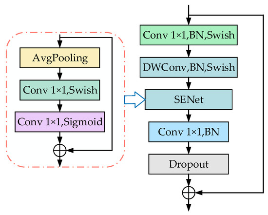 According to the analysis of the architecture parameters in Table 1, the central element of the EfficientNet-b0 model is the MBConv, whose detailed structure is shown in Figure 5. The MBConv module initially employs convolution on the input feature map to modify its channel dimension. Subsequently, depthwise convolution is utilized to perform spatial filtering on the features with reduced dimensions, significantly decreasing the number of model parameters. Thereafter, the channel attention mechanism, known as the SE module, is integrated to enhance the response strength of the loquat’s key features through feature re-calibration [27]. Finally, the feature representation undergoes dimensional restoration through pointwise convolution, followed by application of dead connections and skip connections.