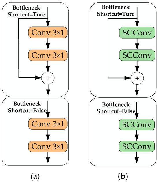 This research incorporates a spatial recombination convolution (SCConv) module [28] into the head. The bottleneck unit of the standard C2f architecture is substituted to achieve this. This enhancement aims to improve the detection model’s representation capabilities. It effectively reduces information redundancy during feature extraction through feature decoupling and channel recombination techniques, significantly boosting the model’s recognition precision. Specific improvements to the module are shown in Figure 6.