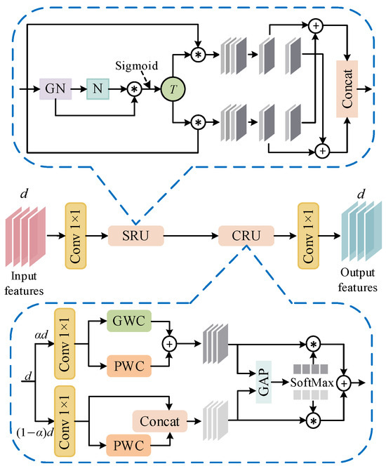 The SCConv module adopts a dual-branch feature optimization architecture, whose core components include a spatial reconstruction unit (SRU) and a channel reconstruction unit (CRU). The SRU extracts importance coefficients of feature maps through group normalization. It separates useful and redundant feature maps, then performs cross-reconstruction on these features. Finally, it concatenates the reconstructed features to generate spatially optimized feature maps. The SRU effectively minimizes redundancy in the spatial dimension while boosting the expressive capability of features. Meanwhile, the CRU separates the input features by channel. It uses group-wise convolution (GWC) to capture high-level information and point-wise convolution (PWC) to obtain detailed information. Next, it employs global average pooling (GAP) to generate channel descriptors and calculates weights via SoftMax. Finally, it fuses weighted information from different channels to generate channel-optimized features. The CRU effectively reduces channel redundancy, enhances feature representation capabilities, lowers computational costs, and improves model inference speed through its “segmentation-transformation-fusion” approach.