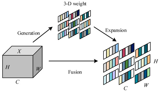 SimAm is an unparameterized attention module that innovatively achieves collaborative optimization of spatial and channel attention. It creates a three-dimensional weight distribution model, assigning distinct saliency weights to each neuron in the feature map. This significantly enhances feature representation capability without introducing extra parameters [29]. The module’s detailed architecture is shown in Figure 8.