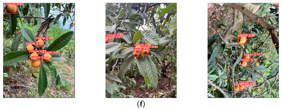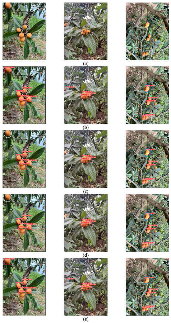 To intuitively compare the performance differences among different backbone networks, three original loquat test images were selected (as shown in Figure 9a). After adopting different backbone networks, the detection and recognition results of loquats in the three original images are presented in Figure 9b–f, respectively.