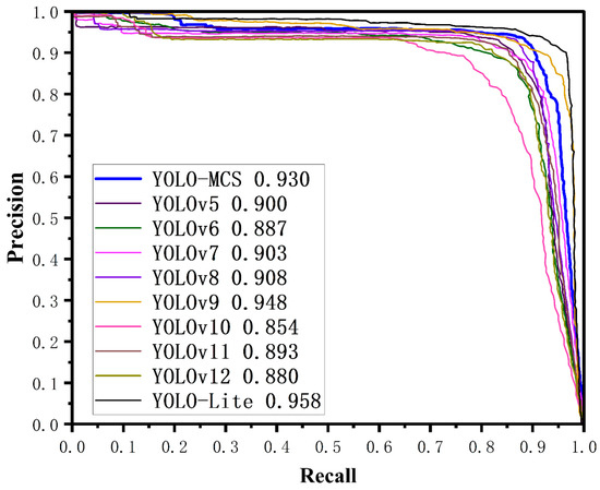 Precision-Recall curves of the proposed YOLO-MCS model and several representative YOLO variants under identical testing conditions. The P-R curve illustrates the trade-off between Precision and Recall at different confidence thresholds, with a position further to the upper right indicating superior overall detection performance. The legend lists the corresponding mAP values for each model, enabling direct comparison of detection robustness and highlighting the relative advantages of the proposed method.