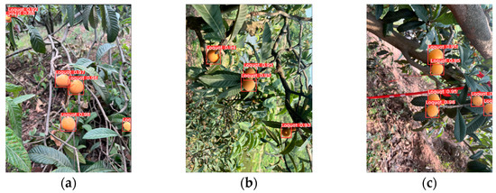 As shown in Figure 11, the experimental data are derived from loquat fruit images captured under varying lighting conditions, shooting angles, and occlusion levels. The structure and parameters of the YOLO-MCS model remain consistent in this study; however, evaluation results across different loquat datasets indicate significant differences in Precision and Recall, while the mAP shows relatively minor variations. According to Table 8, under the three distinct conditions, the model’s Precision values are 87.3%, 87.0%, and 85.4%, respectively, with Recall rates of 81.7%, 89.0%, and 87.8%.