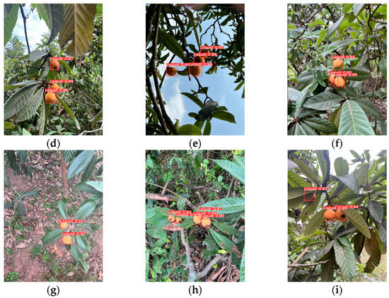 Visual examples of detection results for the proposed model under various challenging conditions. Subfigures (a–c) illustrate performance under different lighting environments, including strong illumination, backlighting, and low-light scenes. Subfigures (d–f) show detection outcomes from different camera perspectives, reflecting viewpoint variations commonly encountered in orchard operations. Subfigures (g–i) present cases with different levels of occlusion caused by leaves, branches, or overlapping fruits. These examples demonstrate the model’s robustness to illumination changes, viewpoint shifts, and occlusion interference, highlighting its capability to adapt to diverse real-world orchard scenarios.