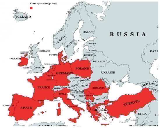 The dataset covers 15 countries (Albania, Belgium, Denmark, France, Germany, Greece, Ireland, Italy, the Netherlands, Poland, Portugal, Romania, Serbia, Spain, and Türkiye, Figure 1) for the period between 2015 and 2024. Annual tomato cultivated area (ha) and production (tonnes) were extracted primarily from Eurostat and complemented, where necessary, with FAOSTAT and national statistical reports to address missing values or reporting gaps [59]. The period 2015–2024 was selected to maximize cross-country completeness within a consistent post-2015 reporting window while capturing recent variability under increasing climatic and market pressures. The country set reflects the intersection of (i) data availability for the full period and (ii) representation of contrasting production orientations, including open-field and protected cultivation profiles across Europe and neighboring countries (Table 1).