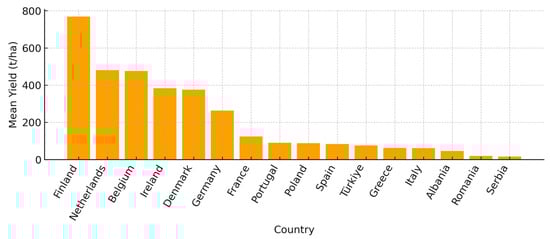 Mean yield (2015–2024), variability (standard deviation), 95% confidence intervals, and ranking across the 15 countries were calculated (Table 3). the Netherlands and Belgium present the highest mean yields, while Romania and Serbia show the lowest values. Ireland and Denmark also appear high in the ranking; however, because their cultivated areas are extremely small and nearly constant at national scale, yield ratios and dispersion diagnostics should be interpreted cautiously for cross-country comparisons and should not be treated as structurally comparable to larger-scale national sectors.