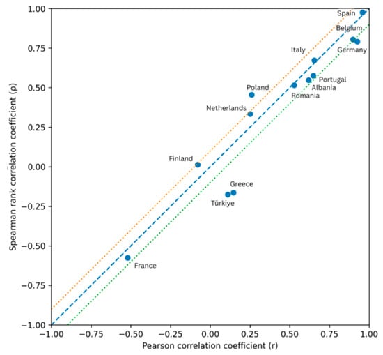 The comparative graphical representation of Pearson (r) and Spearman (ρ) coefficients provides a visual and analytical assessment of the robustness of the linearity assumption in the relationship between cultivated area and tomato production (Figure 3). The positioning of points relative to the reference diagonal r = ρ and to tolerance bands of ±0.10 enables identification of the dominant association type for each country. Countries located close to the diagonal and within the ±0.10 bands (e.g., Spain, Italy, Romania, Belgium) show very similar r and ρ values. This indicates that the dependence between production and area is predominantly linear and stable, and that rank ordering is consistent with linear variation. In these cases, the use of linear regression (OLS) is methodologically justified without significant information loss.