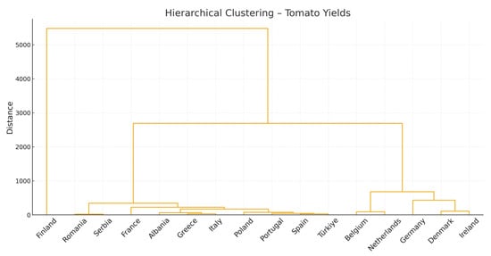 The heatmap of pairwise yield correlations (Figure 5) indicates groups of countries with similar yield trajectories over 2015–2024, as well as countries with divergent temporal behavior. Correlations were computed on annual national yields (t/ha) over the 10-year window; therefore, similarity reflects co-movement patterns in aggregated yield dynamics rather than within-country production-structure homogeneity.
