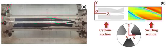 This study employs a vane-type hydro-cyclone, which induces swirling flow by imposing boundary conditions through fixed vanes, thereby generating a bounded swirling flow within the pipeline [7]. Guide-vane hydro-cyclone is primarily used in hydraulic conveying systems, where vanes force axial flow in pressurized pipelines to produce stable tangential velocity components. A photograph of the guide-vane hydro-cyclone is shown in Figure 2a. The guide-vanes are fixed inside a circular pipe. The vanes are made of PMMA and have been given a matte finish to minimize refraction of the laser beam [8]. The hydro-cyclone connects to the pressurized pipeline system with an inner diameter of d = 0.1 m. The key geometric parameters of the guide-vanes in this study are as follows: The axial projection length of the guide-vanes varies between 0.3 m and 0.5 m. Each guide-vane consists of a straight section and a curved section, with the straight section fixed at 0.1 m in length. The lb/l ratio (lb: the curved segment length; l: the total guide-vane length) is set to 2/3, 5/7, 3/4, 7/9, and 4/5. The height of a single guide-vane is 35 mm (0.035 m), with a thickness of 5 mm (0.005 m). The curved section design was achieved through curvature control, specifically rotating the guide-vane by 1° every 20 mm along its length. At the assembly level, three guide-vanes were employed, evenly spaced at 120° intervals around the circumference. The pipe section housing the guide-vane is termed the vane section (0.5 m long), while the immediately downstream pipe section is designated as the swirling section. This study normalizes the remaining length parameters using the pipe diameter as the characteristic length for the flow domain. The overall structural parameters of the guide-vane hydro-cyclone model and its coordinate establishment method are shown in Figure 2b. The flow condition parameters were selected based on previous relevant studies. The Reynolds number Re was defined as Re = ρud/μ, with Re = 140,000 and Re = 210,000 chosen as flow condition parameters. The study was conducted at a constant temperature of 20 °C. The final research conditions are shown in Table 1.