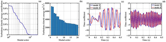 Turbulence kinetic energy and time coefficient in vane section: (a) TKE contribution curve; (b) TKE of 1st 20 modes; (c) time coefficient of Modes 1 and 2; (d) time coefficient of Modes 3 and 4.