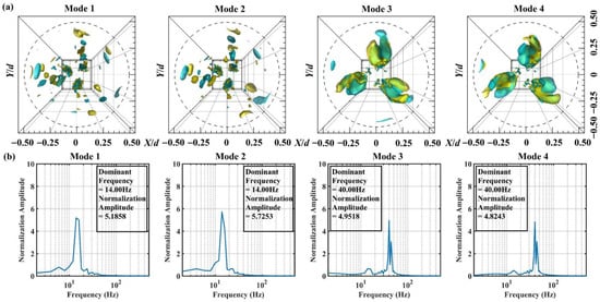The flow structures corresponding to Modes 1 to 4 are further illustrated in Figure 9a, where the vortex cores are similarly represented by the magnitude of the axial swirling of the swirling flow. The corresponding FFT spectra for these modes are shown in Figure 9b. As depicted in Figure 9a, for the first and second modes, the vortex cores within the swirling flow are distributed sequentially along the direction of the time-averaged PVC structure’s spiral precession, with alternating positive and negative rotation. This arrangement forms three sets of composite PVC structures rotating at 120° intervals within this region. Compared to the vane section in Figure 9a, the vortex core within the vortex flow section lacks complete morphology. This indicates that momentum exchange occurs between the vortex cores during their spatiotemporal precession, leading to the fragmentation of the PVC. The spectra corresponding to the first and second modes are shown in Figure 9b. The dominant frequencies of Modes 1 and 2 are identical at 6 Hz, with a relative spectral peak difference of only 2.52%. The coherent structures of the third and fourth-order modes, as depicted in Figure 7a, exhibit morphology similar to that of the first and second modes. The spectra corresponding to Modes 3 and 4 are shown in Figure 9b. Modes 3 and 4 share an identical dominant frequency of 4 Hz, with a relative peak difference of 14.44%. Spatially, the coherent structures of these four modes represent the low-frequency helical precession of the PVC structure [18]. In terms of time–frequency characteristics, the dominant frequencies of Modes 1 to 4 are 6 Hz and 4 Hz, respectively, which are lower than the background flow fundamental frequency of 14 Hz. The fundamental frequency of the swirling flow, calculated using the guide-vane characteristic length, is about u/l = 5 Hz. The dominant frequencies of Modes 1 to 4 are similar to the fundamental frequency of the swirling flow, with their average frequency approximating the fundamental frequency of the swirling flow. Therefore, these modes are considered swirling flow modes, representing the rotational pulsation component of the bounded swirling flow. This indicates that the flow frequencies in the swirling section (4 Hz, 6 Hz) differ from the fundamental frequency (14 Hz) of the dominant mode in the bounded flow of the vane section. The swirling section has transitioned from swirling flow to become the dominant flow mode in this region.