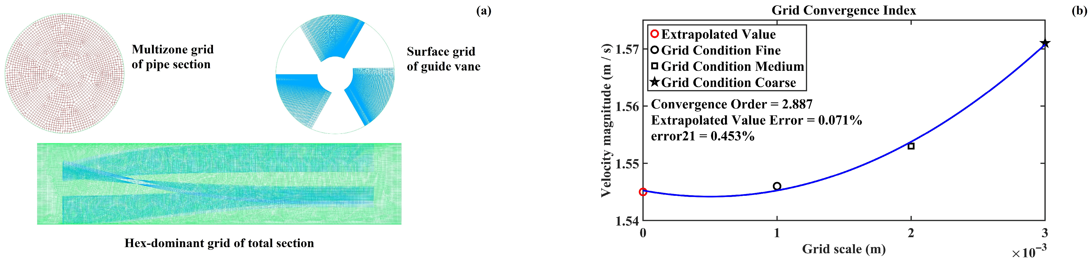 Schematic of calculation domain and meshing condition: (a) schematic of grid condition; (b) Grid Convergence Index analysis.