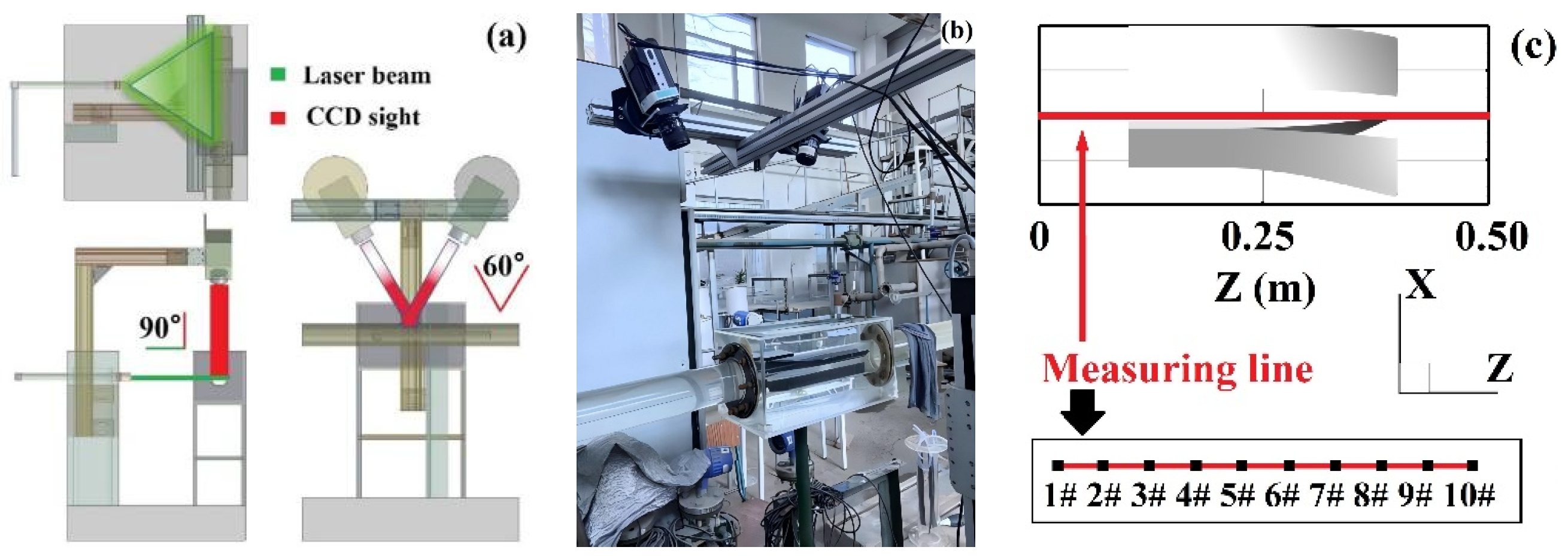 PIV setup: deployment of physical particle image velocimetry experiment: (a) schematic of PIV system; (b) photograph of PIV system; (c) deployment of measuring lines.