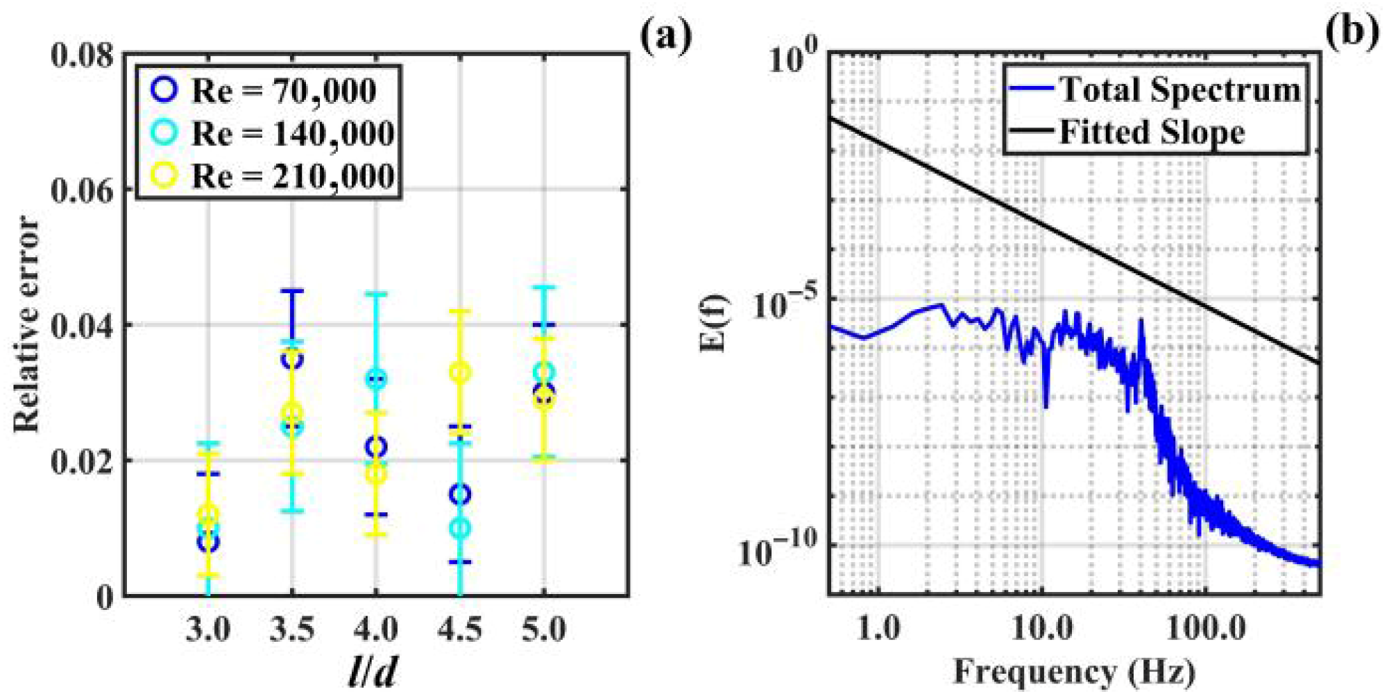 Figure 5b. The relative error between the spectral slope of the inertial sub-scale region and the −5/3 power law straight line is less than 2.00%. Furthermore, considering the relative error and uncertainty between the numerical simulation results in