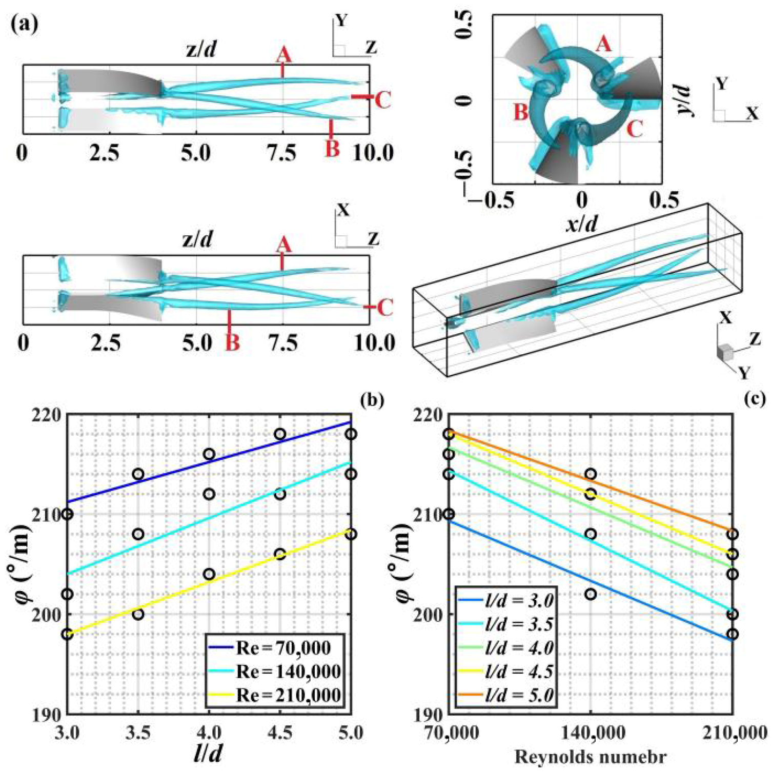 From an engineering application perspective, the study quantified the local head loss induced by the swirling flow. The local head loss coefficient ranged from 0.23 to 0.36, varying with operating conditions. For a fixed l/d, the coefficient slightly decreased with increasing Re. For a fixed Re, the coefficient increased significantly with increasing l/d. For example, at l/d = 5.0, the loss coefficient decreased from 0.3537 at Re = 70,000 to 0.3324 at Re = 210,000. Under the condition of Re = 140,000, the loss coefficient increased from 0.2439 to 0.3486 as l/d increased from 3.0 to 5.0. This provides a clear trade-off for optimizing guide-vane design: longer guide-vanes enhance swirling intensity by rotation effect of precessing vortex core, benefiting particle suspension and mixing uniformity, but also incur greater energy loss.