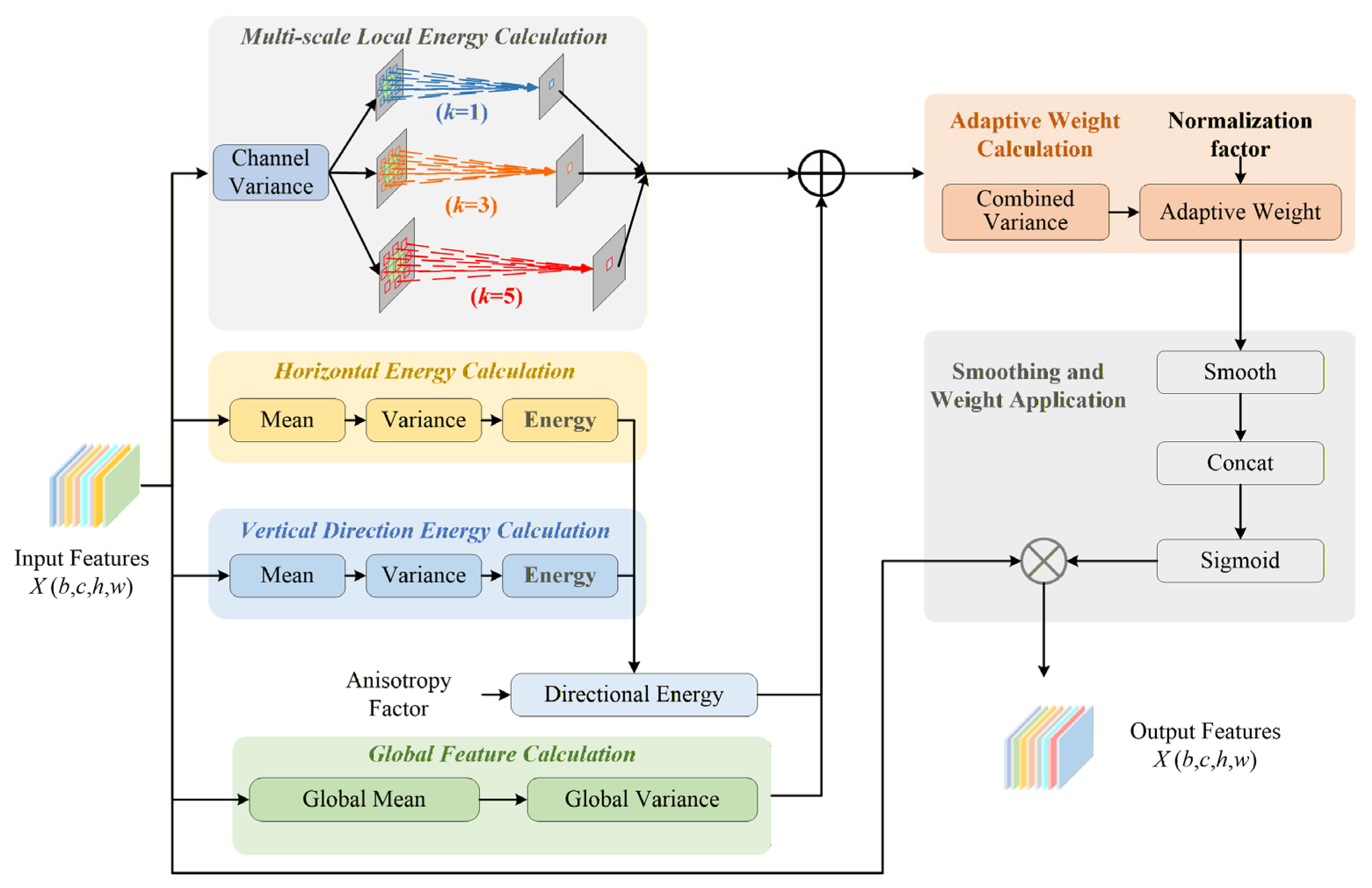 In the feature fusion stage, an adjustable anisotropy factor is introduced. Combined with weight coefficients, it integrates the horizontal and vertical directional energies to obtain a unified directional energy. This directional energy is then combined with the global variance to generate a composite variance term, thereby achieving adaptive fusion of global and directional features. The adaptive weight calculation phase adopts the normalization process from the original SimAM [