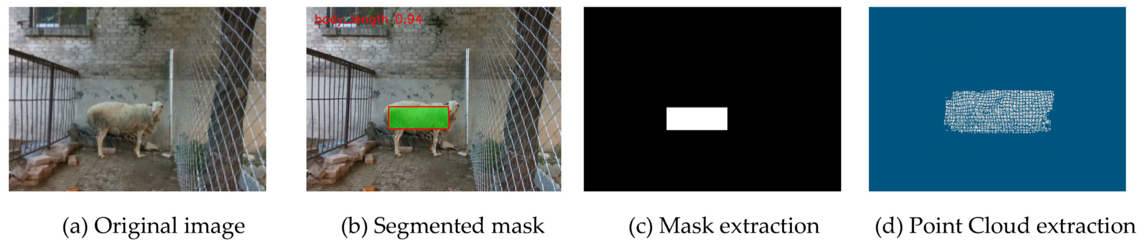 Figure 1c). These images formed the RGB dataset for the segmentation task. The dataset was partitioned into training, validation, and test subsets in a 7:2:1 ratio at the animal level, such that all images belonging to the same sheep were assigned to only one subset. During model development, the training set was used to optimize the network parameters, the validation set was used exclusively for hyperparameter tuning and model selection, and the held-out test set was reserved for the final performance assessment. This animal-level splitting protocol prevents the same individual from appearing in multiple subsets and thus effectively mitigates the risk of data leakage and overly optimistic performance estimates. In a separate acquisition phase, RGB-D data were collected for 3D point-cloud reconstruction and body-dimension measurement. These RGB-D samples were used exclusively for downstream measurement evaluation and were not involved in model training, validation, hyperparameter tuning, or threshold selection.