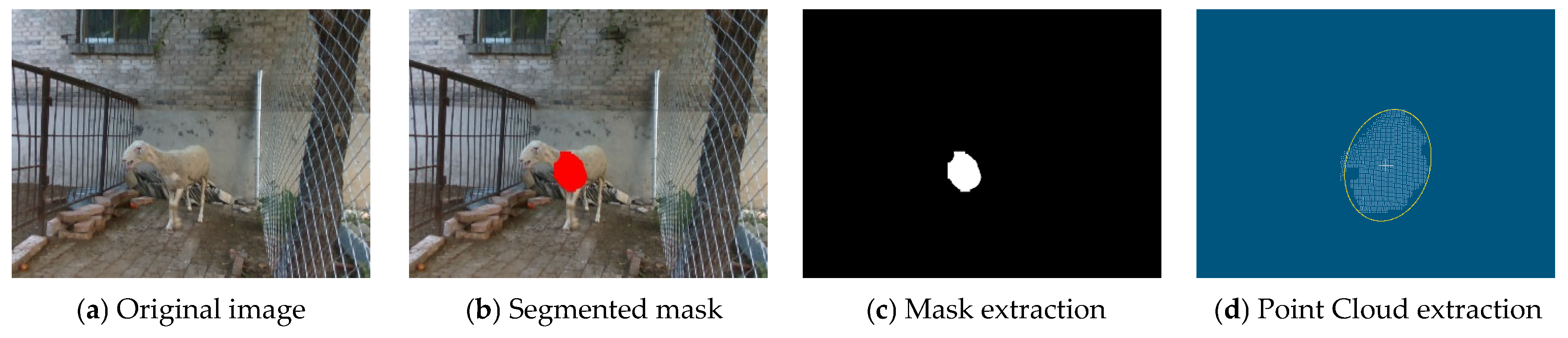 First, the improved YOLOv12n-Seg-SSM model performs instance segmentation to obtain region masks corresponding to the target body dimensions. To improve boundary stability in complex farm environments, the predicted masks are refined using lightweight morphological operations (e.g., hole filling and boundary smoothing). Second, depth completion and validity filtering are applied to mitigate missing or noisy depth values caused by occlusion, illumination changes, and wool texture. The refined masks are used to select valid depth pixels, which are then back-projected into three-dimensional space using the calibrated camera intrinsics, thereby generating a masked point cloud that represents the sheep body surface.