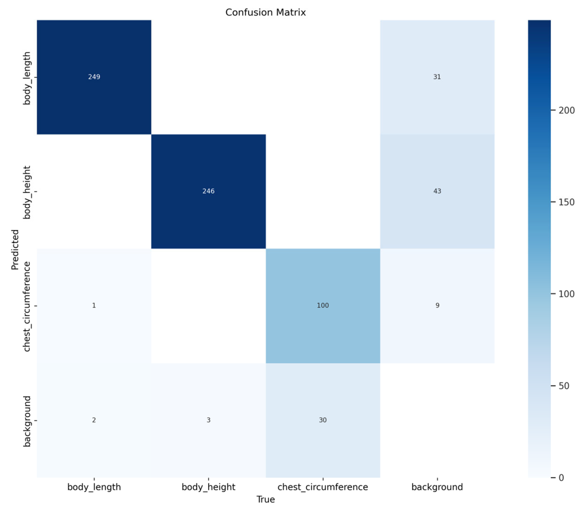 Figure 11 demonstrates the model’s classification performance in sheep body measurement detection: the body_length category correctly identified 249 samples with only 3 misclassifications, and the body_height category correctly identified 246 samples with 43 misclassifications, indicating good differentiation of vertical body measurements. The chest_circumference category correctly identified 10 samples with 9 misclassifications. Additionally, 10 samples in the background class were misclassified as chest_circumference (likely due to visual confusion between the circular chest contour and visually similar background areas), yet the overall classification accuracy remained high. Overall, the model demonstrated outstanding classification accuracy for body_length and body_height, while maintaining good performance for chest_circumference. Category confusion occurred only in a small number of samples. This both reflects the model’s strong robustness in distinguishing between different body measurement targets and backgrounds and validates the effectiveness of the customized improvement strategy targeting sheep body measurements across different orientations and morphological features.