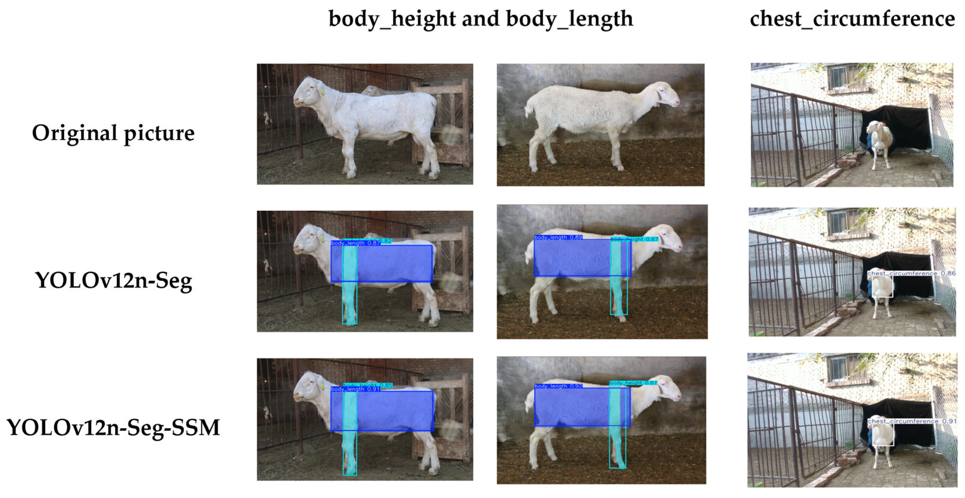 Figure 12, we conducted a visual evaluation to assess its detection capabilities, providing an intuitive comparison between the proposed model and the original YOLOv12n-Seg outputs. The improved YOLOv12n-Seg-SSM model produces bounding boxes that provide more complete coverage and tighter fitting around the sheep’s body length, body height, and chest circumference regions. For instance, the body-length bounding box fully encloses the sheep’s torso length area, the body-height bounding box precisely corresponds to the vertical range from the highest point of the shoulder blades to the ground, and the chest-circumference bounding box closely follows the circular contour of the chest. Even under complex backgrounds (brick walls, iron fences) and non-standard sheep postures, the improved model maintains stable detection results with minimal disruption to confidence scores. This demonstrates enhanced scene adaptability, laying a more reliable 2D detection foundation for subsequent 3D body measurement calculations.