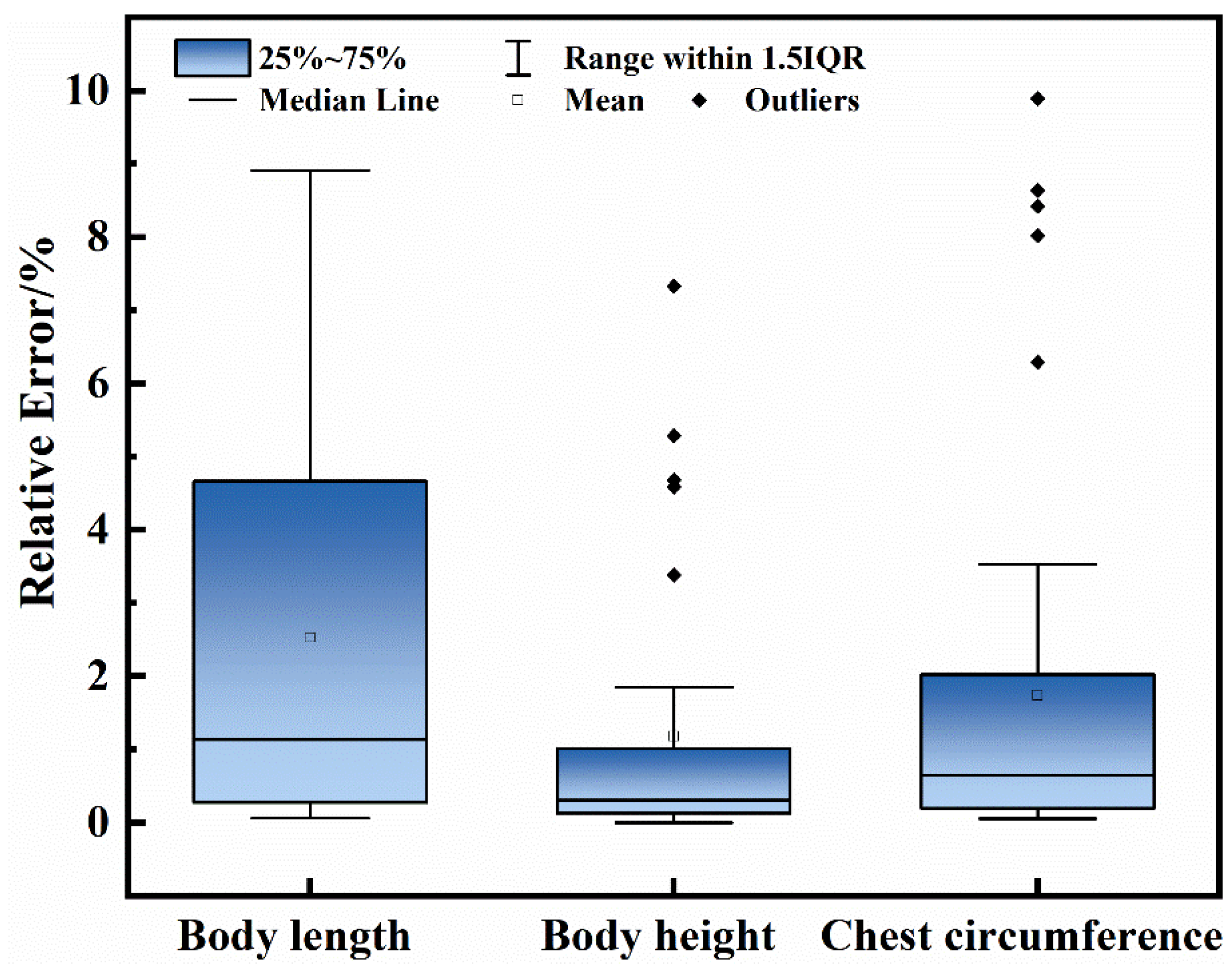 6]. The experimental results on 43 Hu sheep indicate that the proposed system can achieve practical measurement accuracy under farm conditions, with mean relative errors below 5% for body height, body length, and chest circumference. In addition to point estimates, we report animal-level bootstrap 95% confidence intervals, which characterize reliability more clearly than averaged errors alone and help assess field readiness.