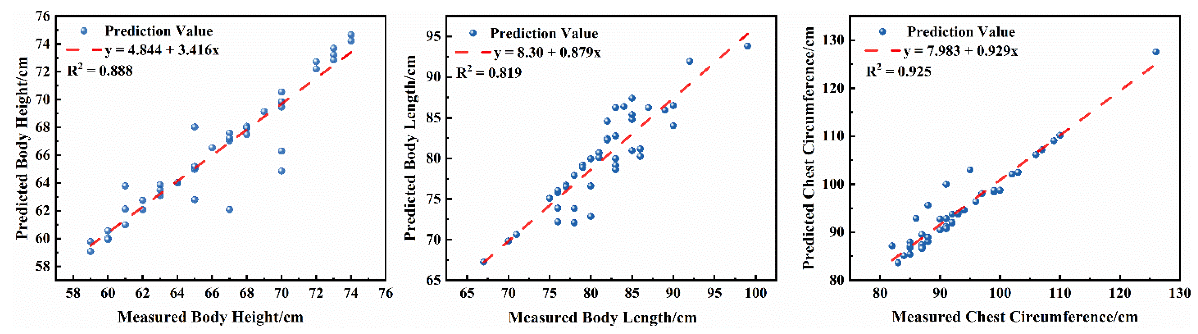 The results of the regression analyses indicate that the predicted body measurements for sheep exhibit linear correlations with the actual measurements. The regression coefficients for body height, body length, and chest circumference were , and , respectively, all indicating high levels of correlation. Outliers in body height and body length predictions primarily stemmed from variations in viewing angles, occlusions, and changes in posture, whereas outliers in chest circumference measurements were mainly influenced by leg and neck interference. Overall, the improved model reliably and accurately reflects actual variations in key sheep body measurements, demonstrating excellent precision and reliability in non-contact measurements of body height, body length, and chest circumference. This provides robust data support for subsequent individual growth monitoring and trait evaluation.