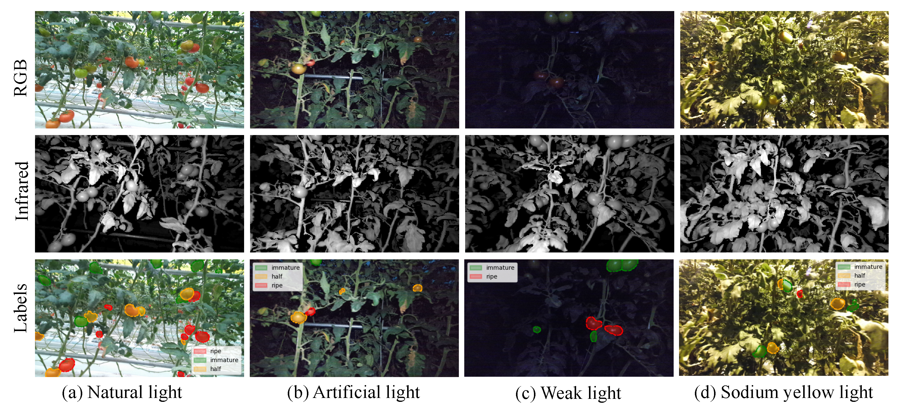 Figure 1. The dataset provides annotations for both target detection and semantic segmentation across three fruit maturity stages: unripe, half-ripe, and ripe. To facilitate robust model training and evaluation, a total of 1389 images were selected and partitioned into training, testing, and validation subsets using standard proportions of approximately 70%, 15%, and 15%, respectively. RGB images were used to form the RGB dataset, while near-infrared images were organized with identical splits to create the near-infrared dataset. This arrangement ensures that both modalities maintain consistent representations across lighting conditions and maturity stages, enabling effective multimodal learning for small-object detection and semantic segmentation of tomato fruits in diverse environmental scenarios.