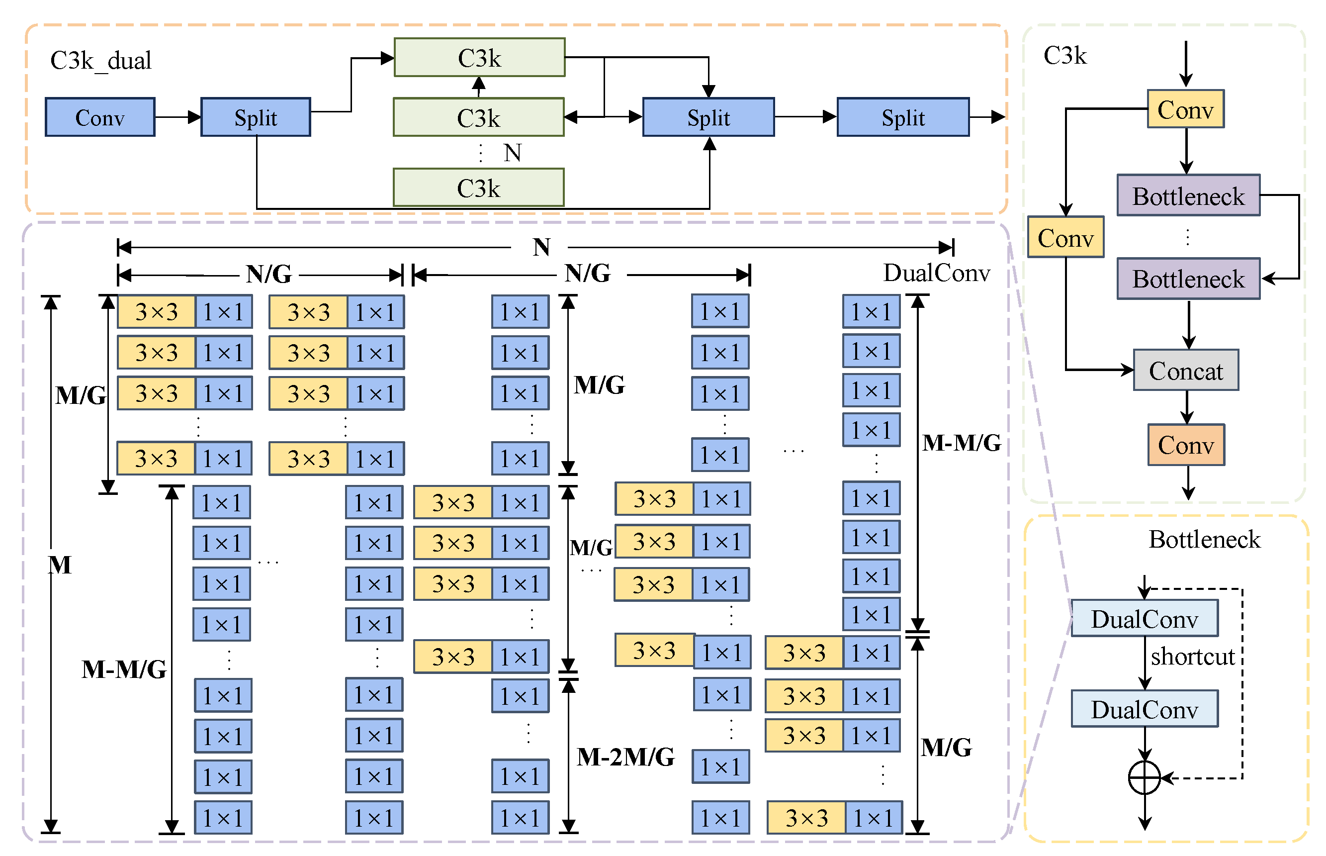 DualConv is a novel convolutional mechanism that combines the complementary advantages of group convolution and heterogeneous convolution to improve both representation capacity and inter-channel information exchange. Specifically, for each filter group, DualConv performs a 3 × 3 group convolution on a subset of the input channels to capture local spatial features, while simultaneously applying a 1 × 1 pointwise convolution across all input channels to retain global contextual information and facilitate effective cross-channel interaction. The outputs of these parallel branches are then summed, enabling the network to preserve rich spatial and semantic information while reducing feature redundancy. Unlike traditional group convolution, where each kernel operates on only a limited portion of the input feature map (typically 1/G of the total channels), DualConv enhances this architecture by equipping each group with a complementary 1 × 1 convolution path. This design allows spatially grouped operations to access the complete input feature map, mitigating the information bottleneck commonly induced by channel partitioning. In contrast to HetConv, which alternates between 3 × 3 and 1 × 1 kernels in a fixed pattern, DualConv maintains uninterrupted and parallel 1 × 1 convolutional paths, thereby preserving more continuous and complete semantic representations. The architectural details of the C2f-DCB module are depicted in