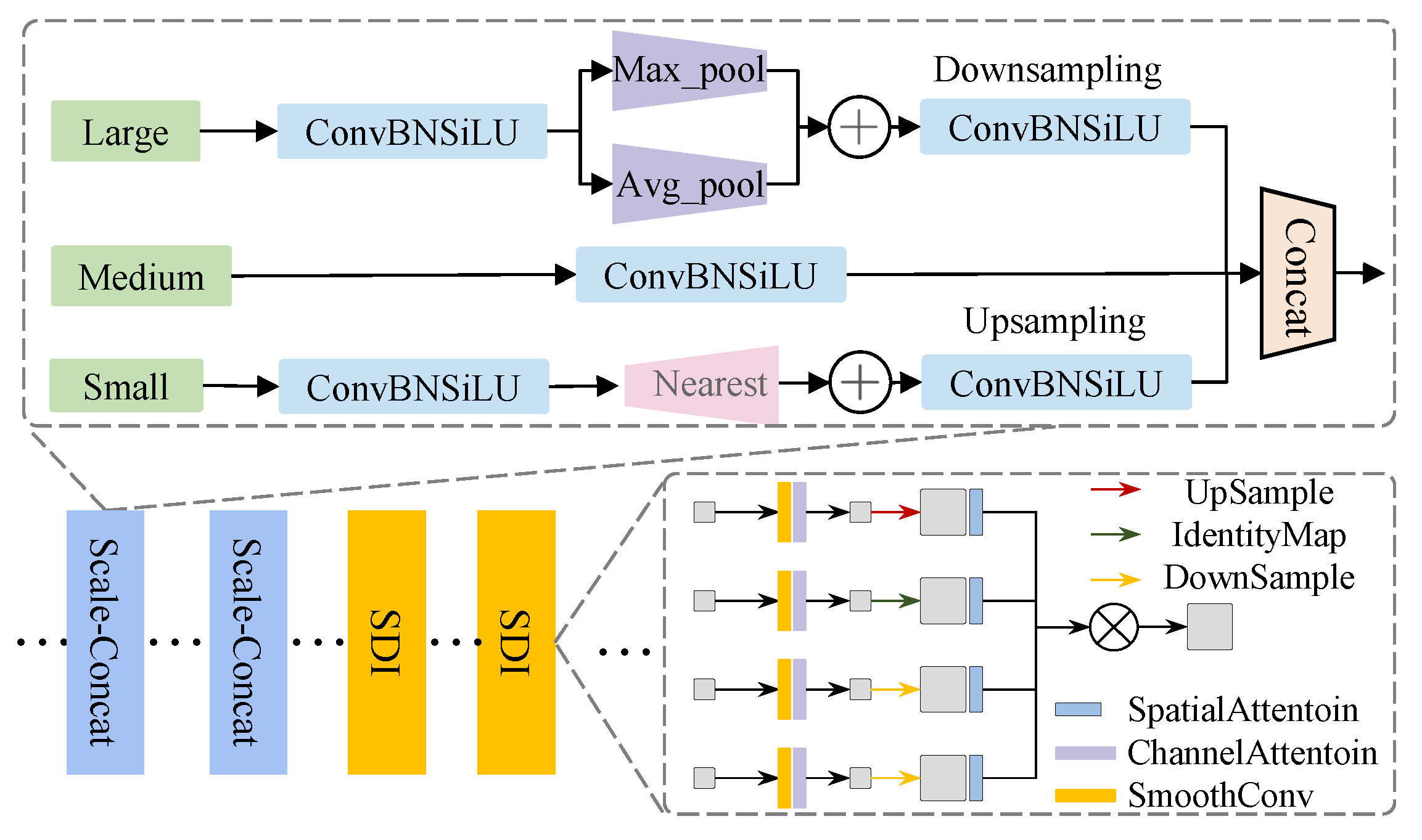 This paper designs a Scale-Concatenate Fusion Module (Scale-Concat) to improve the expressiveness of multi-scale features. Unlike traditional Feature Pyramid Networks (FPNs), Scale-Concat processes large-, medium-, and small-scale feature maps in parallel. Each scale is first passed through a 1 × 1 convolution to unify the channel dimensions. For large-scale feature maps, a combination of max pooling and average pooling is employed to downsample spatial resolution while enhancing translational invariance. In contrast, small-scale feature maps are upsampled using nearest-neighbor interpolation to preserve local details such as edges and textures, effectively mitigating the loss of small-object features caused by background interference during upsampling [
