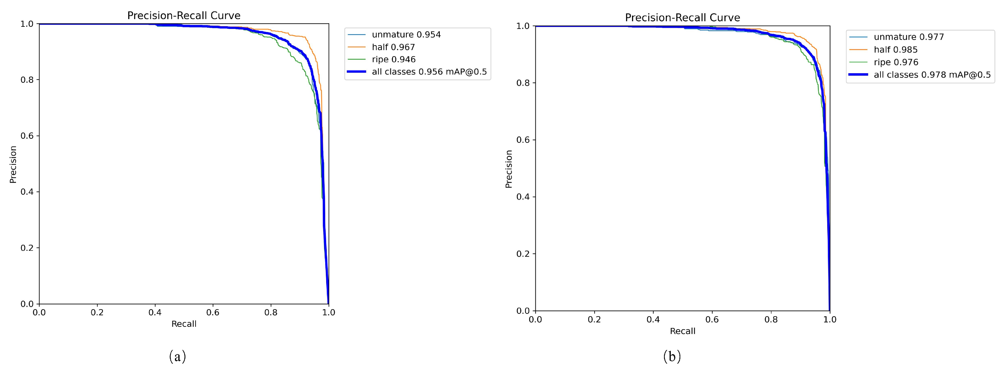 Figure 7 compares the PR curves of tomato detection at different maturity stages (unripe, half-ripe, ripe) for the YOLO-MSRF model and the baseline. The YOLO-MSRF model shows a larger area under the PR curve, indicating superior performance in segmentation and detection accuracy. The proposed YOLO-MSRF achieves a higher PR-AUC than the baseline (97.8 vs. 95.6), indicating a better precision–recall trade-off.