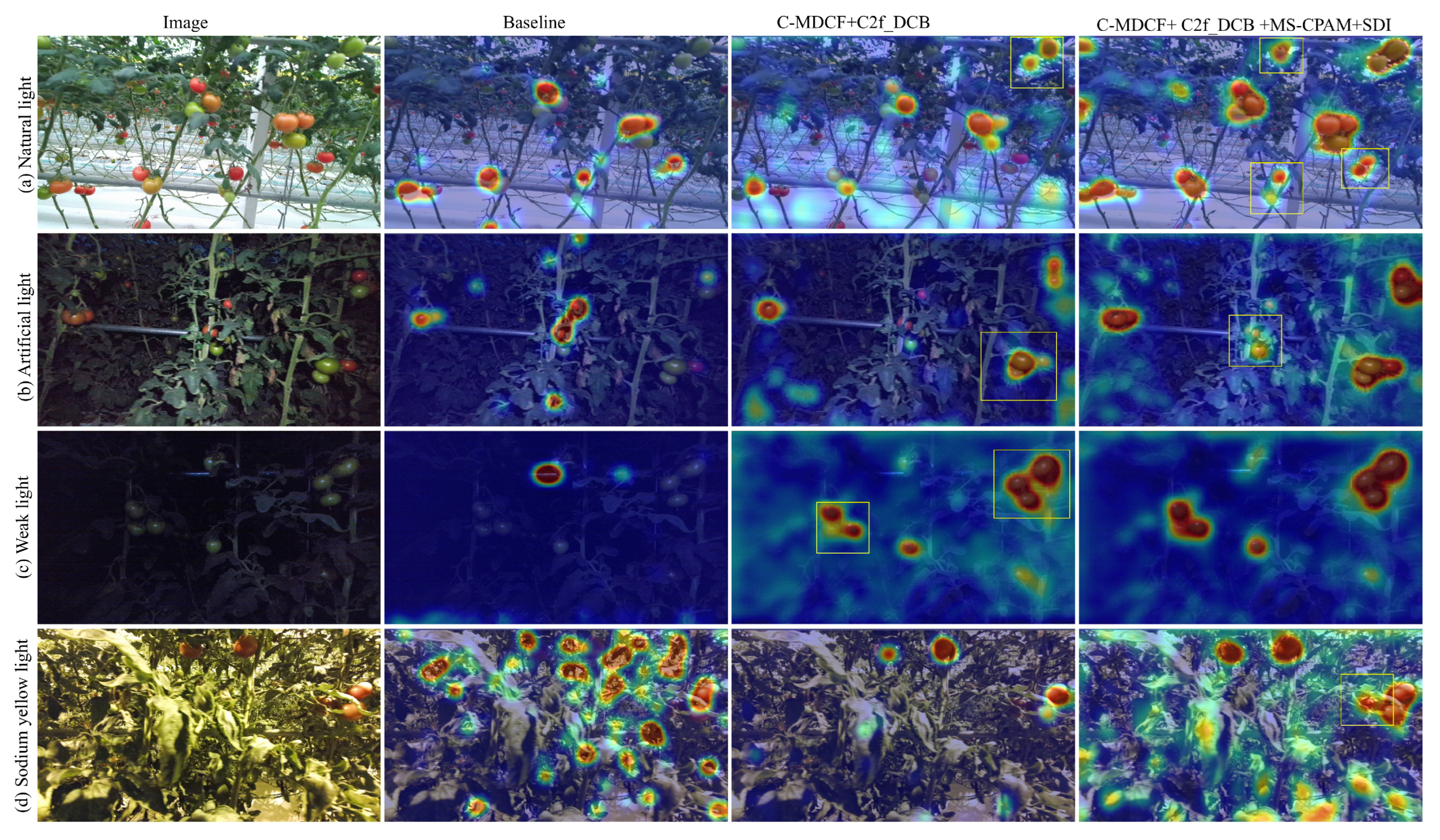 Further enhancements are evident in the fourth column, where MS-CPAM + SDI modules are introduced. Heatmaps clearly indicate that MS-CPAM amplifies the model’s responsiveness to objects at various scales, especially small tomatoes, by capturing local key features through its multi-scale channel attention mechanism. Simultaneously, the SDI module refines spatial attention to emphasize critical regions, boosting segmentation accuracy for occluded or blurred-edge targets. Additionally, this module improves representation of complex textures such as leaf edges, preserving fine details and sharpening segmentation boundaries.