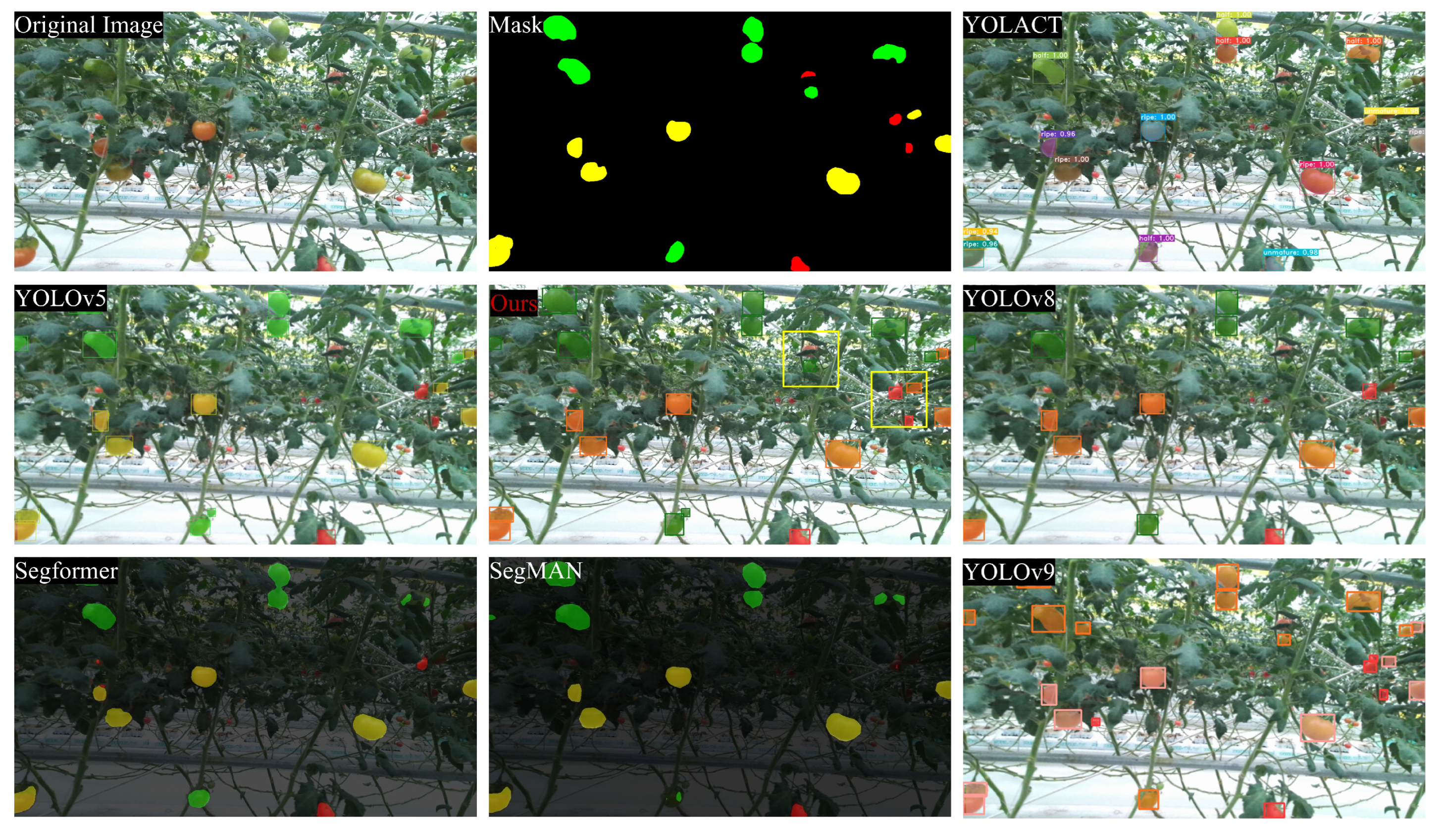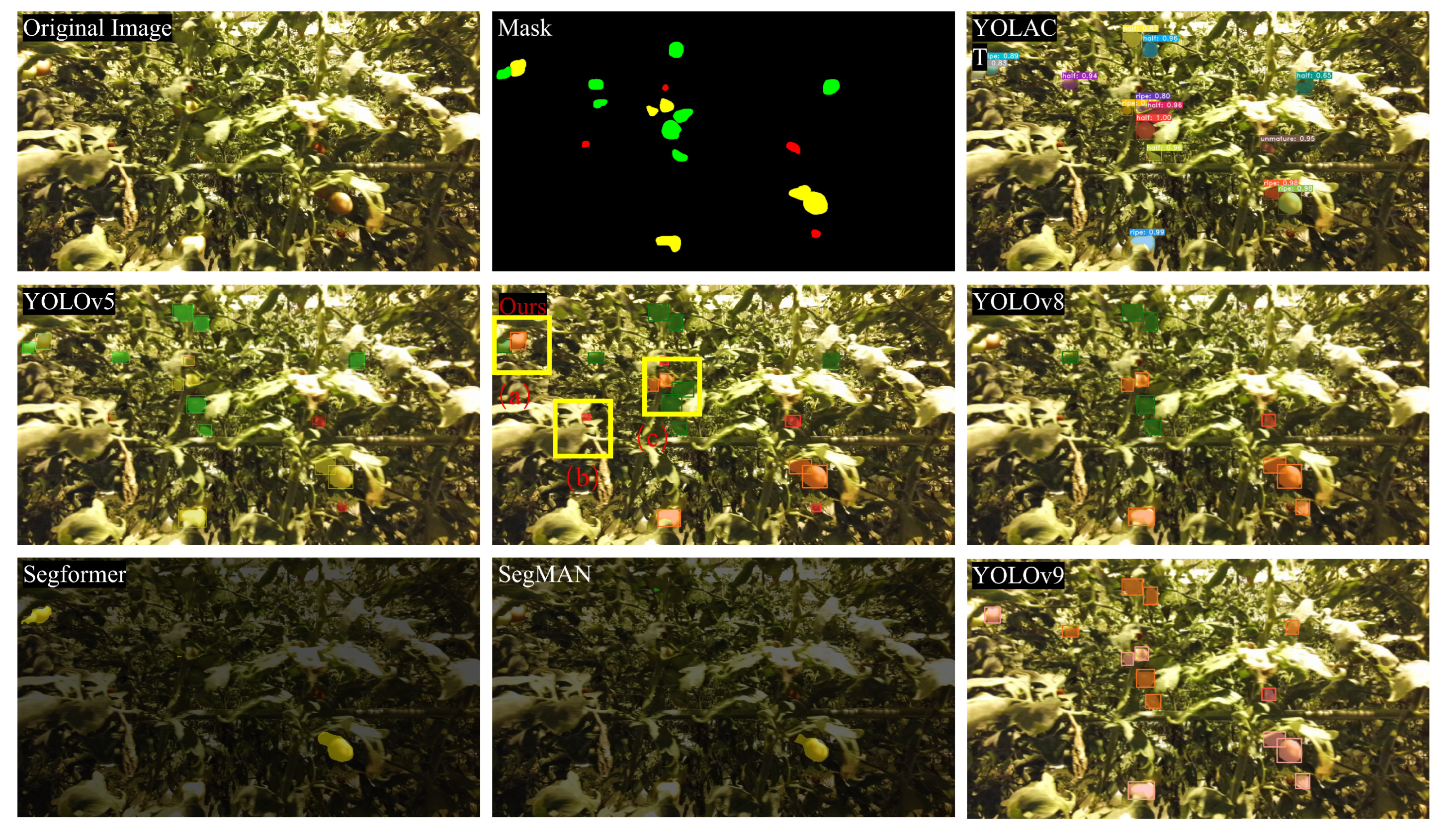Figure 12, the tomato segmentation performance under sodium-vapor lighting conditions demonstrates that our proposed method successfully detects both (c) green tomatoes with background-like coloration and small-target tomatoes (a) and (b). In stark contrast, conventional segmentation methods including SegFormer and SegMAN show extremely limited capability in tomato detection under this specific lighting condition, indicating their low photosensitivity and resulting in remarkably poor segmentation accuracy. While YOLOv5 fails to detect semi-mature tomatoes, YOLACT, YOLOv8, and YOLOv9 exhibit relatively better performance in recognizing most tomato instances, albeit with limited effectiveness for small-target tomatoes. These comparative results clearly highlight that our method achieves superior performance in sodium-vapor lighting environments, particularly in detecting more small-target tomatoes while maintaining precise segmentation boundaries.