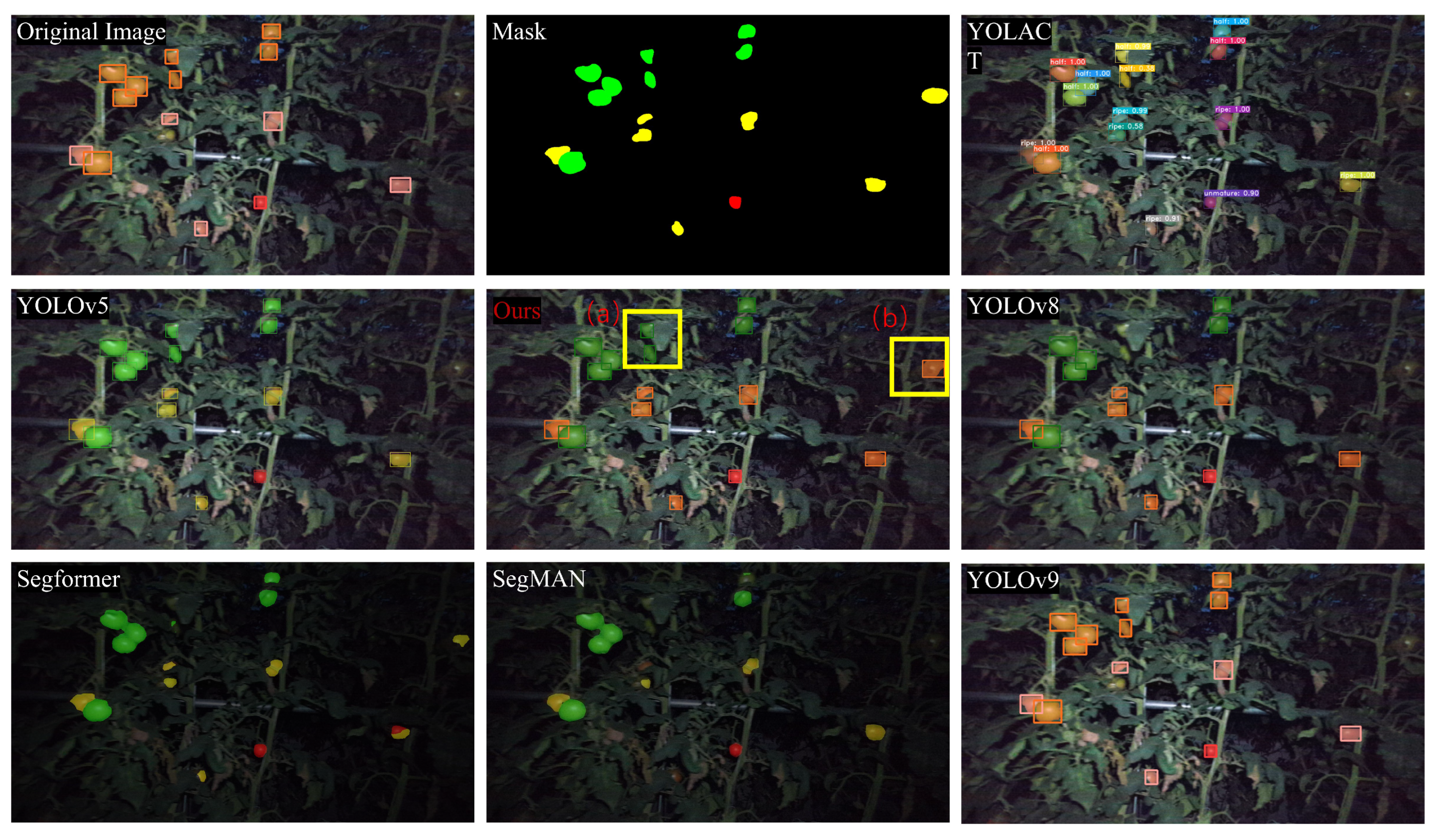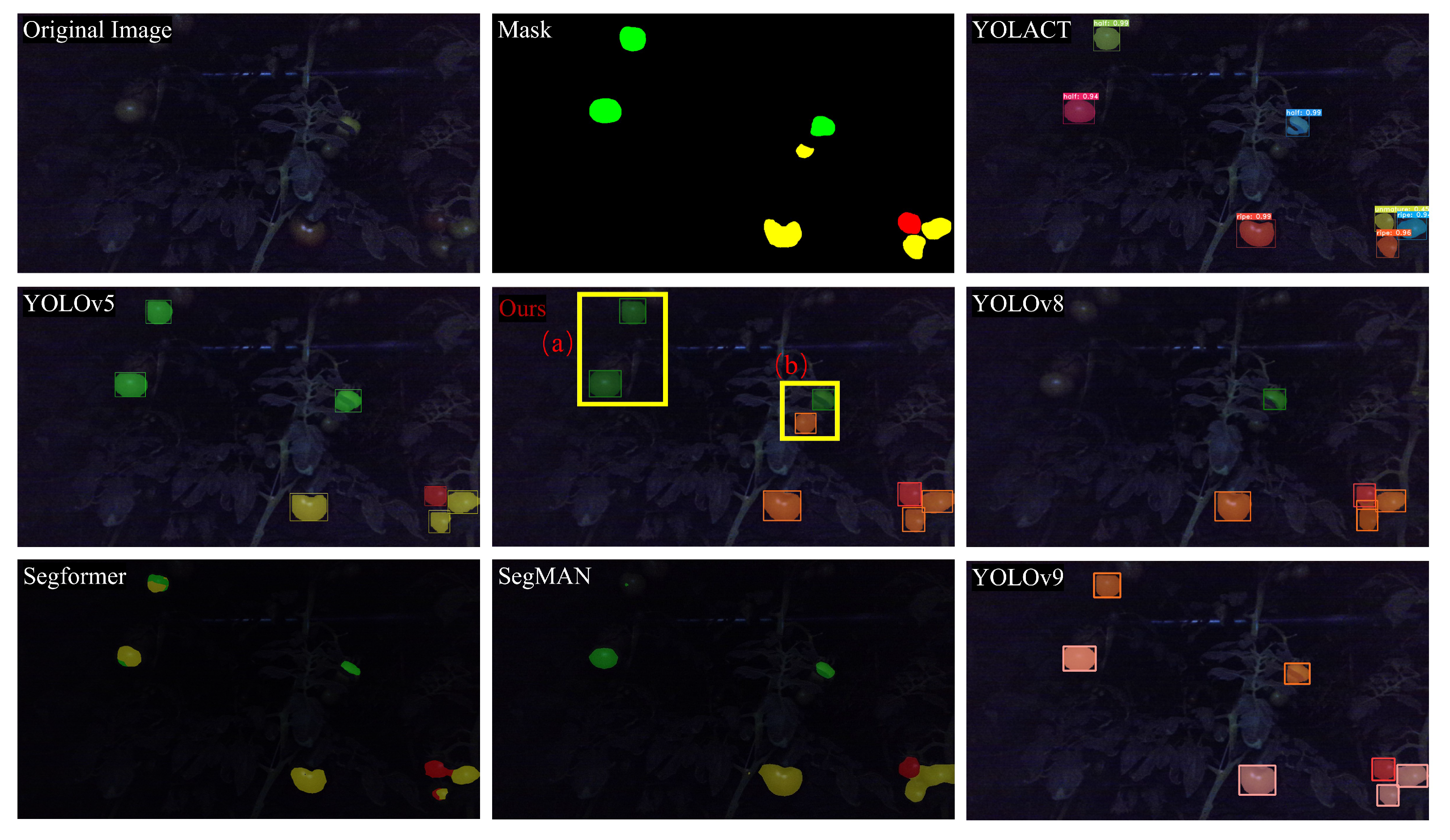 Figure 11, the tomato segmentation results under low-light conditions show that our proposed method effectively handles both (a) green tomatoes with background-like coloration and (b) occluded tomatoes. In comparison, traditional segmentation methods like SegFormer and SegMAN exhibit significantly blurred segmentation boundaries in low-light environments and completely fail to detect tomatoes that blend with the background, resulting in remarkably low segmentation accuracy. While YOLOv8 shows poor sensitivity to complex backgrounds and cannot detect green tomatoes, YOLACT and YOLOv9 manage to identify most background-colored tomatoes but suffer from classification inaccuracies. YOLOv5 performs better in this condition, correctly classifying and segmenting most tomatoes, yet fails to recognize occluded tomatoes (b). These comparative results clearly indicate that our method achieves superior performance in low-light conditions, detecting more tomatoes while maintaining precise segmentation boundaries. This robust performance demonstrates our method’s exceptional capability in handling challenging scenarios involving color camouflage and occlusion under insufficient lighting.