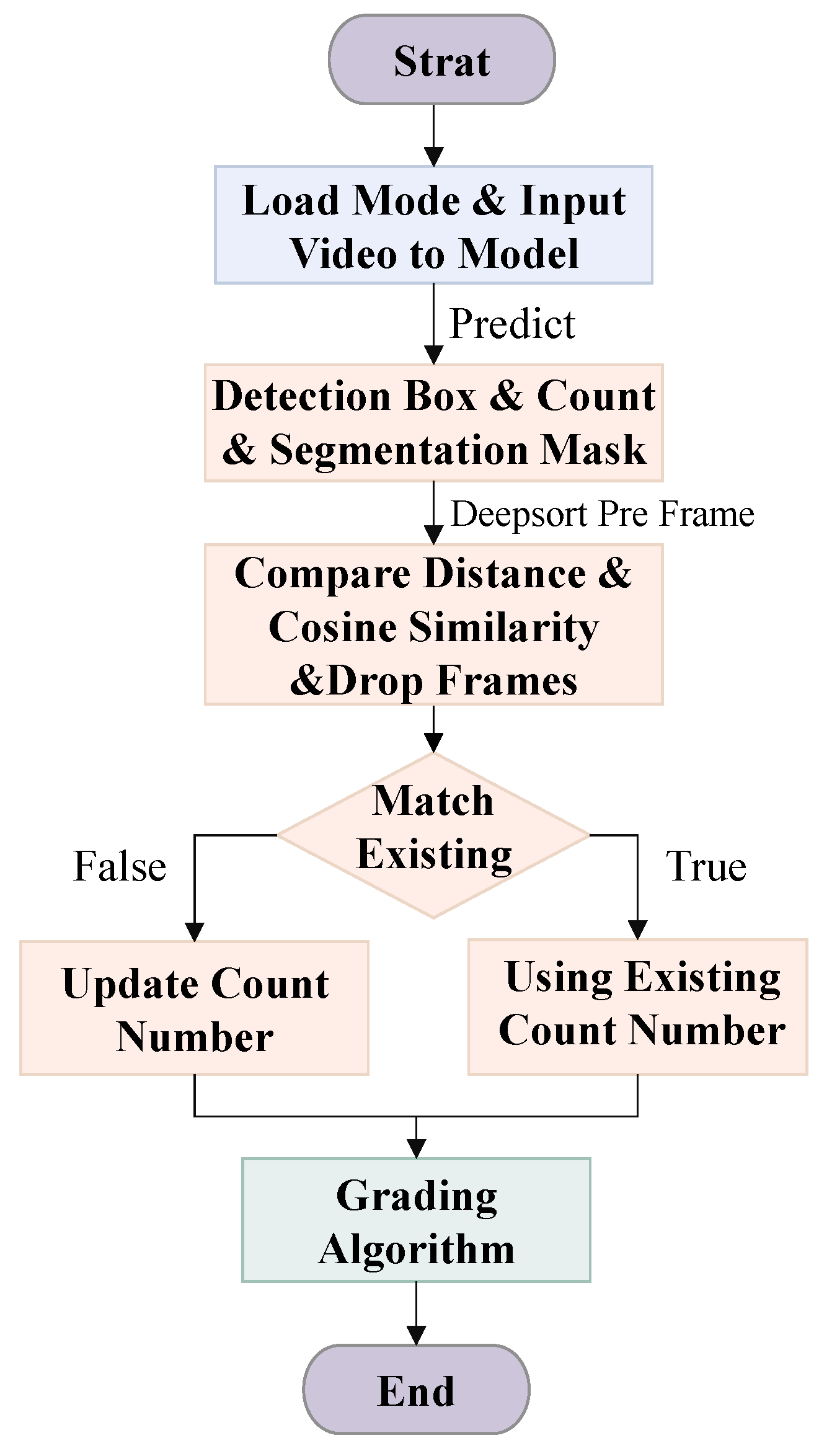 Figure 13. First, a pre-trained model is applied to video frames for detection and instance segmentation, providing each tomato’s bounding box, class, and pixel-level mask, enabling precise localization and pixel-wise representation. The detection results are then fed into a DeepSORT multi-object tracker, which integrates appearance features and spatial information to track tomatoes across consecutive frames. In controlled agricultural environments, tomatoes are often occluded or overlapped. To ensure tracking continuity, a trajectory reconnection mechanism is designed: temporarily lost trajectories, including their last bounding box, class, and appearance embedding, are stored in a candidate list; in subsequent frames, new detections are matched with lost trajectories based on class consistency, appearance similarity, spatial distance, and temporal interval. If matched, the original trajectory ID is restored, allowing short-term occluded tomatoes to regain tracking, while trajectories exceeding the time threshold are discarded to reduce misidentification risk. As shown in