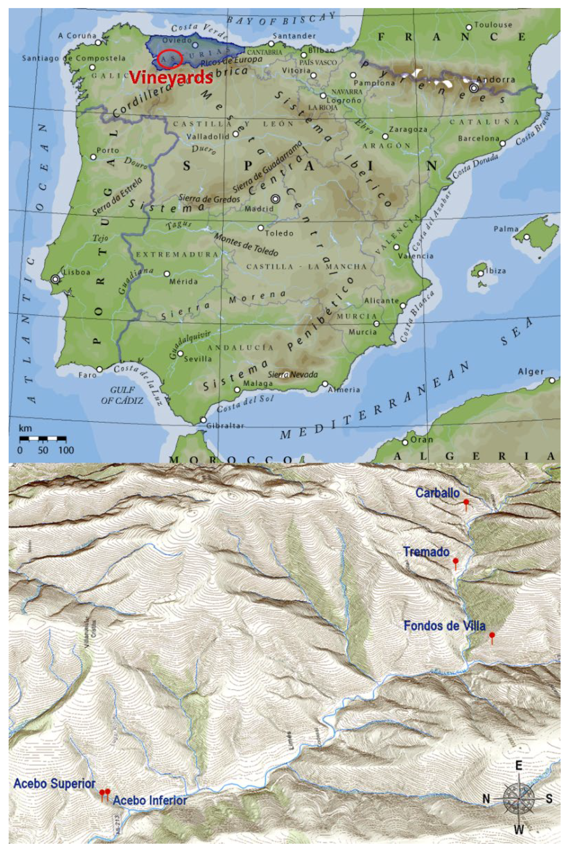 - Boso, S.; Cuevas, J.; Gago, P.; Santiago Blanco, J.L.; Martínez, M.C. La viticultura de montaña asturiana y las amenazas del entorno: Proliferación de las poblaciones de jabalíes. Enol. Mod. 2025, 79, 15. [Google Scholar]